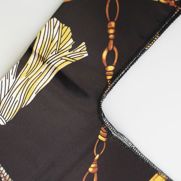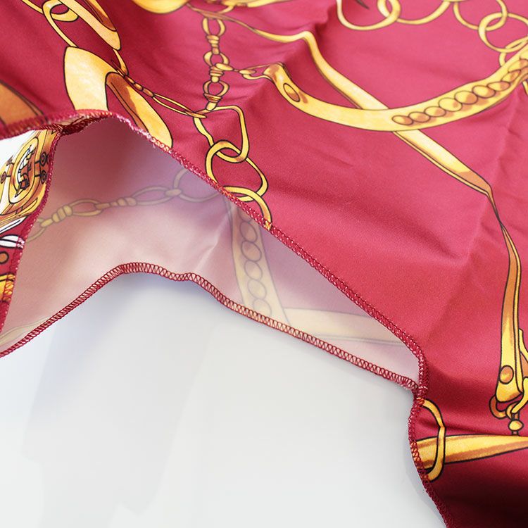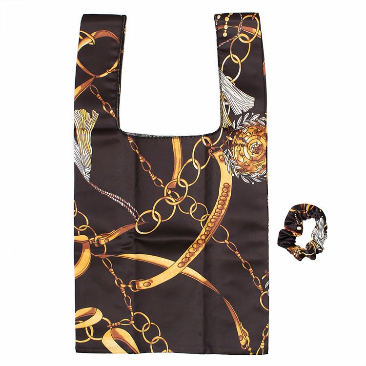 スカーフ柄のプリントだけでなく、生地そのものが持つ程よい張りや光沢感がクラス感を演出。ファッションアイテムのスカーフと遜色ない質感なので、サブバッグやエコバッグとしてご使用になる日にはメインバッグのハンドルに掛けて付属のシュシュで留め、バッグアクセサリーとしてお使いいただくのもオススメです。