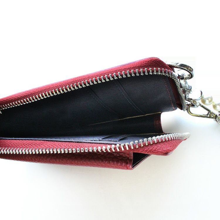 長さ調節可能なストラップにはパールをあしらい、カジュアルになりがちなフォンポーチに大人のエレガントな要素を投入。さらに、明るすぎないカラーもポイント。ダークなレッドは様々なカラーとの相性が良く、ぐっとおしゃれ度を上げてくれます。