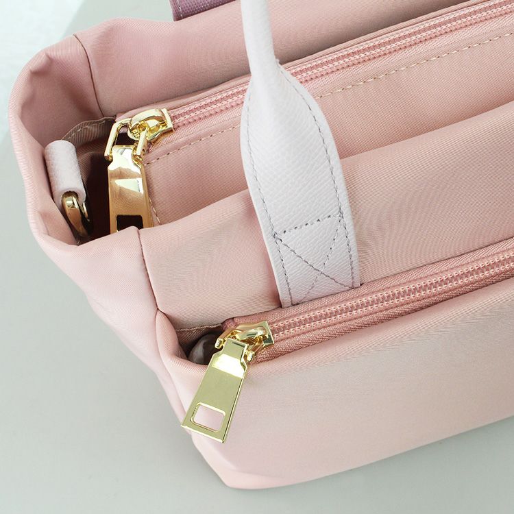 撥水加工のナイロンとレザーにアビステらしいキラキラのビジューを組み合わせたバッグ。とても軽くて付属のショルダーストラップを使えば両手が空く、普段使いから旅行まで活躍間違い無しの便利なアイテムです。手回り品はきちんと収まるサイズ感にファスナーポケットや大きく開く開口部と、使い勝手の良いポイントがたっぷり。
