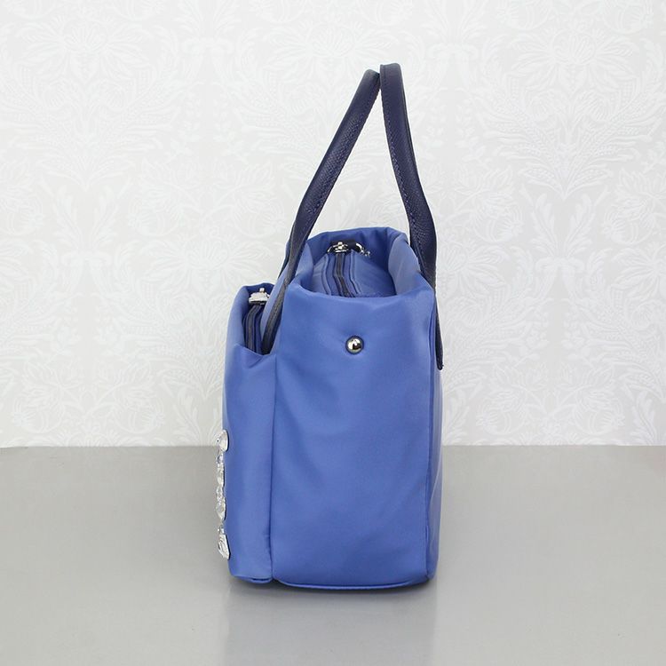 撥水加工のナイロンとレザーにアビステらしいキラキラのビジューを組み合わせたバッグ。とても軽くて付属のショルダーストラップを使えば両手が空く、普段使いから旅行まで活躍間違い無しの便利なアイテムです。手回り品はきちんと収まるサイズ感にファスナーポケットや大きく開く開口部と、使い勝手の良いポイントがたっぷり。