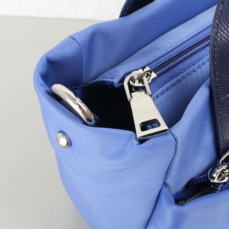 撥水加工のナイロンとレザーにアビステらしいキラキラのビジューを組み合わせたバッグ。とても軽くて付属のショルダーストラップを使えば両手が空く、普段使いから旅行まで活躍間違い無しの便利なアイテムです。手回り品はきちんと収まるサイズ感にファスナーポケットや大きく開く開口部と、使い勝手の良いポイントがたっぷり。