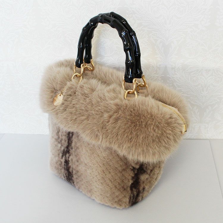 大人かわいいふわふわのエコファーバッグ。取り外し可能なショルダーストラップ付きなので肩掛けや斜め掛けでご利用いただけます。ハンドルはバンブーで大人っぽさを演出。開閉部分はファスナーになっているので、人混みや移動中でも安心です。内側にはファスナー付きのポケットが付いていて、鍵など大切な小物をしっかり収納可能。しっかりとマチがあり、お荷物を十分に収納できるゆったりサイズです。