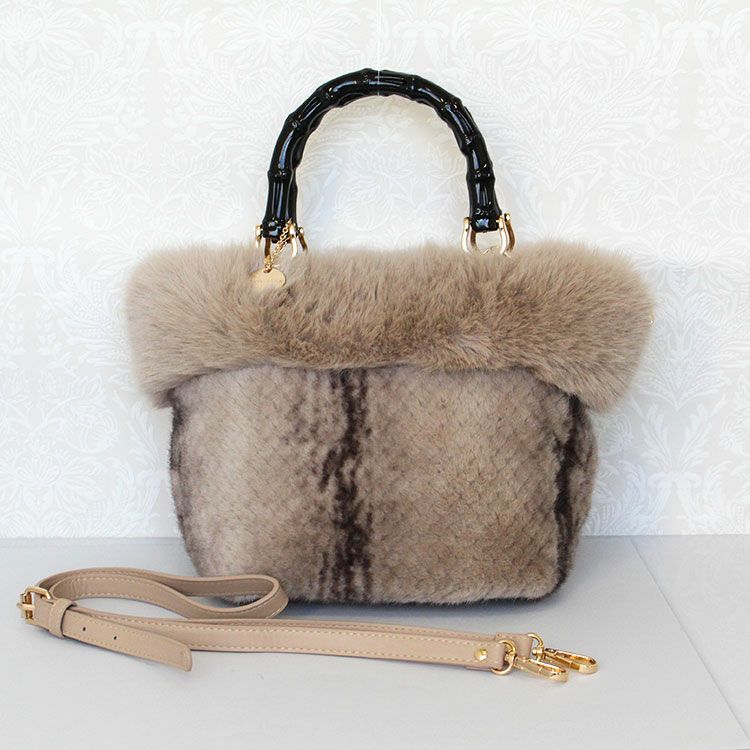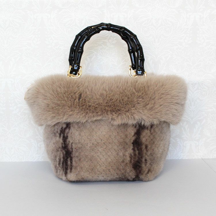 大人かわいいふわふわのエコファーバッグ。取り外し可能なショルダーストラップ付きなので肩掛けや斜め掛けでご利用いただけます。ハンドルはバンブーで大人っぽさを演出。開閉部分はファスナーになっているので、人混みや移動中でも安心です。内側にはファスナー付きのポケットが付いていて、鍵など大切な小物をしっかり収納可能。しっかりとマチがあり、お荷物を十分に収納できるゆったりサイズです。