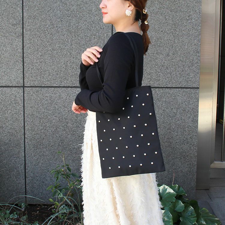 光沢感が美しく、耐久性に優れたナイロンタフタ素材のトートバッグ。片面の全体にあしらわれたクリスタルガラスのビジューが華やかながらもきちんとした印象に見えるデザインで、コーディネートにさりげない華やかさをプラスします。会社での外回り、お子様の学校行事、パーティーやセレモニーなど、あらゆるシーンでのサブバッグとしてもおすすめ。