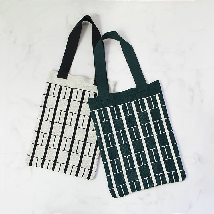 モードな印象の幾何学柄がコーディネートのアクセントに。伸縮性の高い素材を全体に使用しているので、重いものをたっぷり入れると肩紐が長くなるのが気になる場合は、軽いものやかさばるものを入れていただくのがおすすめです。ストレートな長方形のニット素材なので、折りたたんで収納できるのも嬉しいポイント。