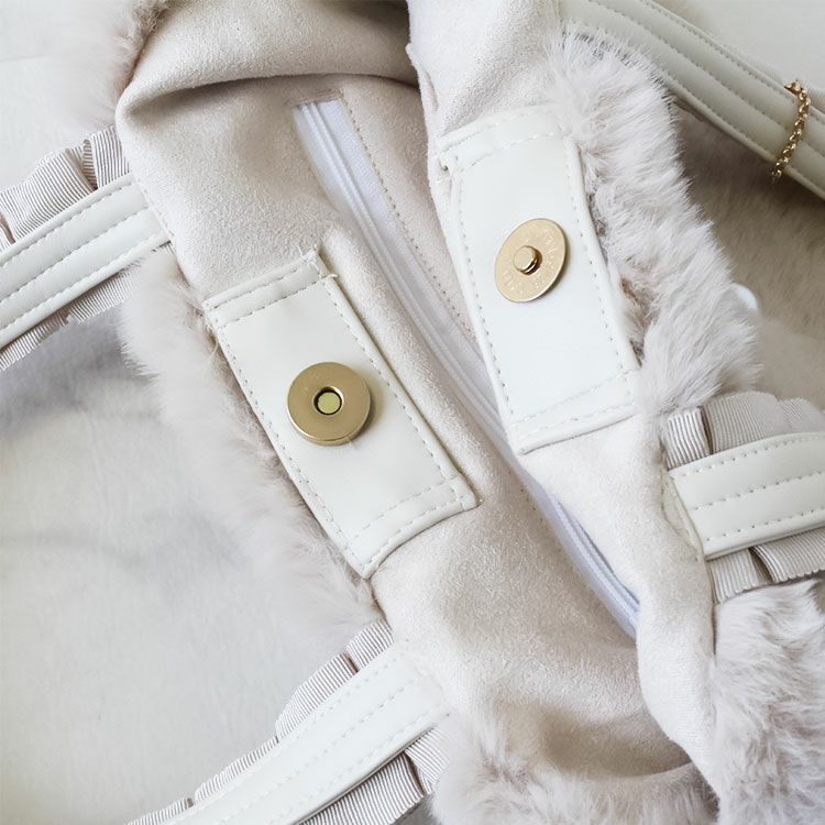 大人可愛いふわふわのエコファーバッグ。大小のパールが、カジュアルになりがちなファーバッグにレディなムードをプラス。全体がファブリックの柔らかい質感で入れるものによって多少形が変わるので、たっぷり収納できます。外したマフラーや500mlペットボトルやタンブラー、長財布などもすっぽり入ります。開閉部分はマグネットになっているので、中身の取り出しもスムーズ。