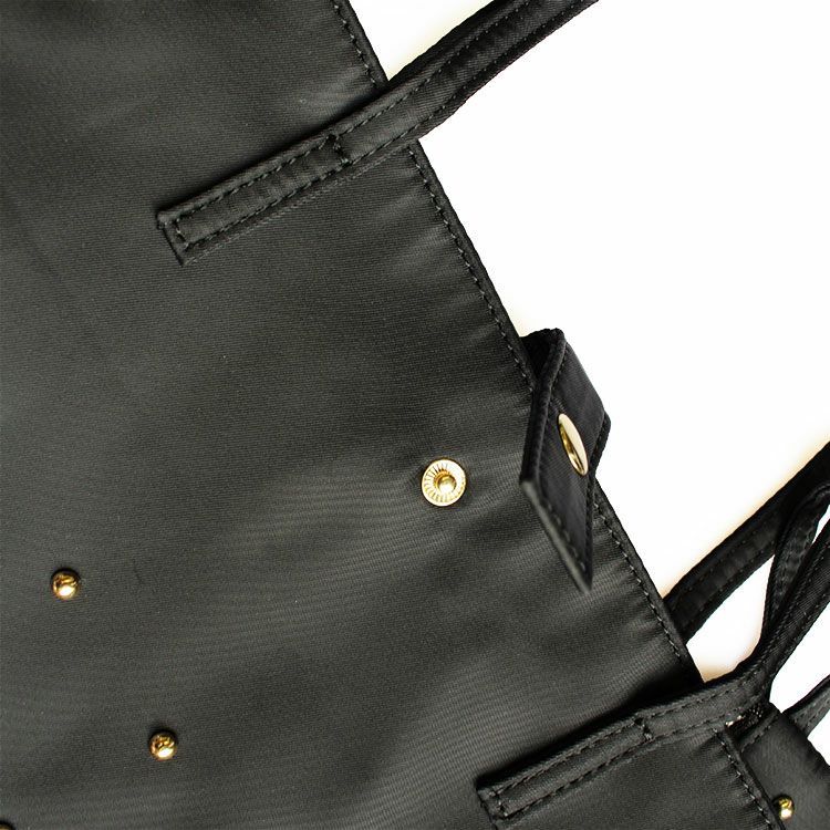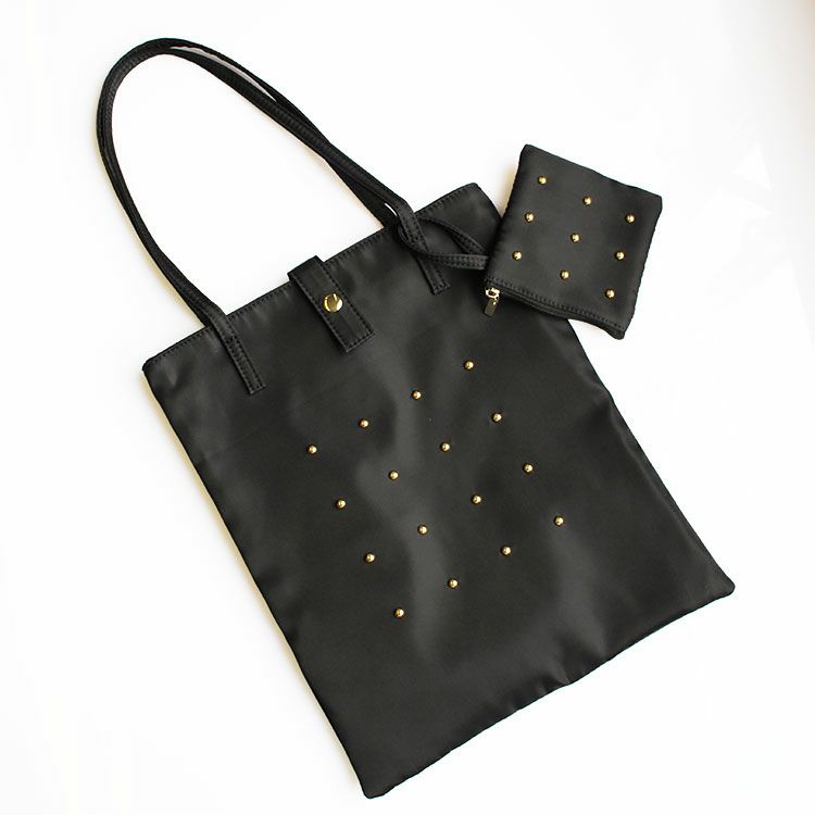 光沢感が美しく、耐久性に優れたナイロンタフタ素材のトートバッグ。ゴールドカラーのスタッズがアクセントのほんのりモード感をプラスした、日常にも使いやすいデザインです。会社での外回り、お子様の学校行事、冠婚葬祭のセレモニーでのサブバッグとしてもおすすめ。さりげない華やかさがあるので、気軽なお出かけの時にはメインバッグとしても活躍します。