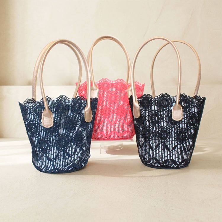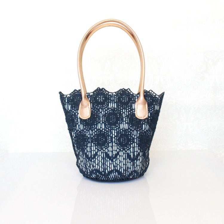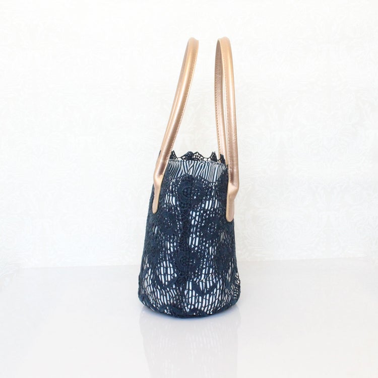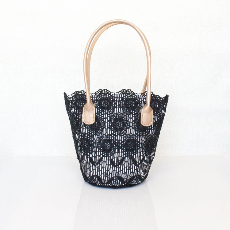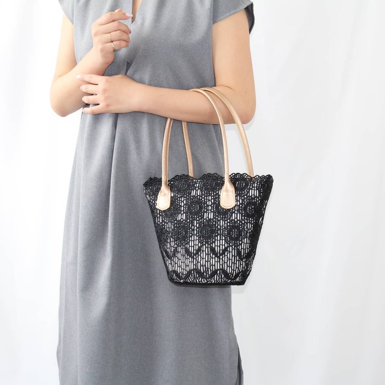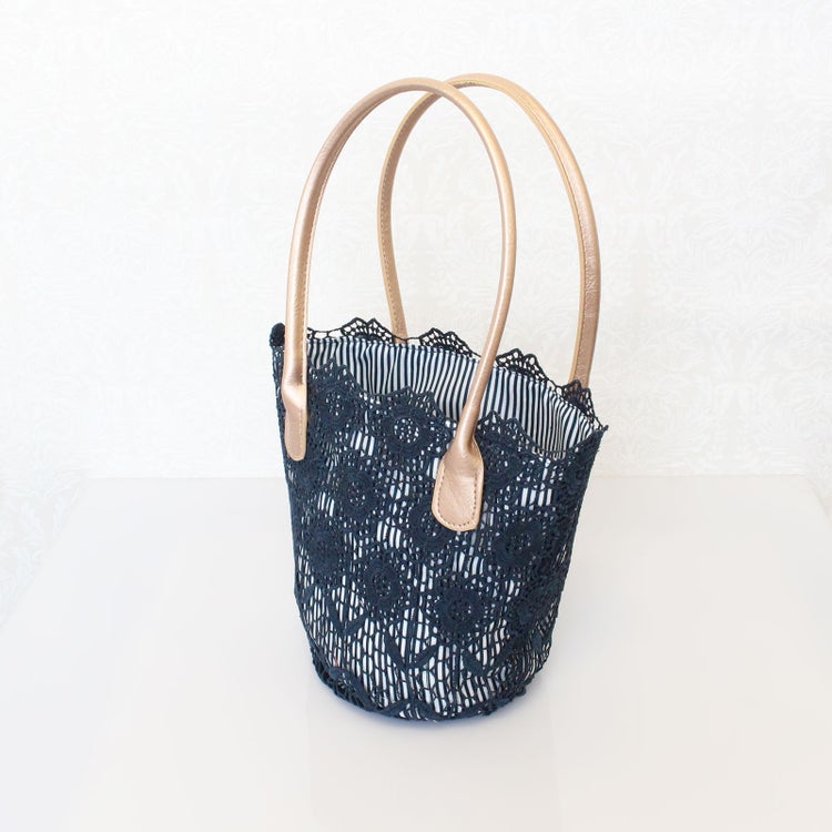 繊細に編み上げたレース生地に樹脂加工を施し、程よいハリ感を持たせたアビステオリジナルバケットトートバッグ。