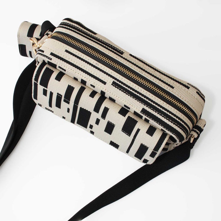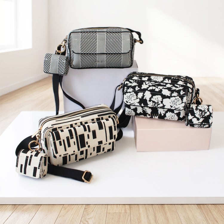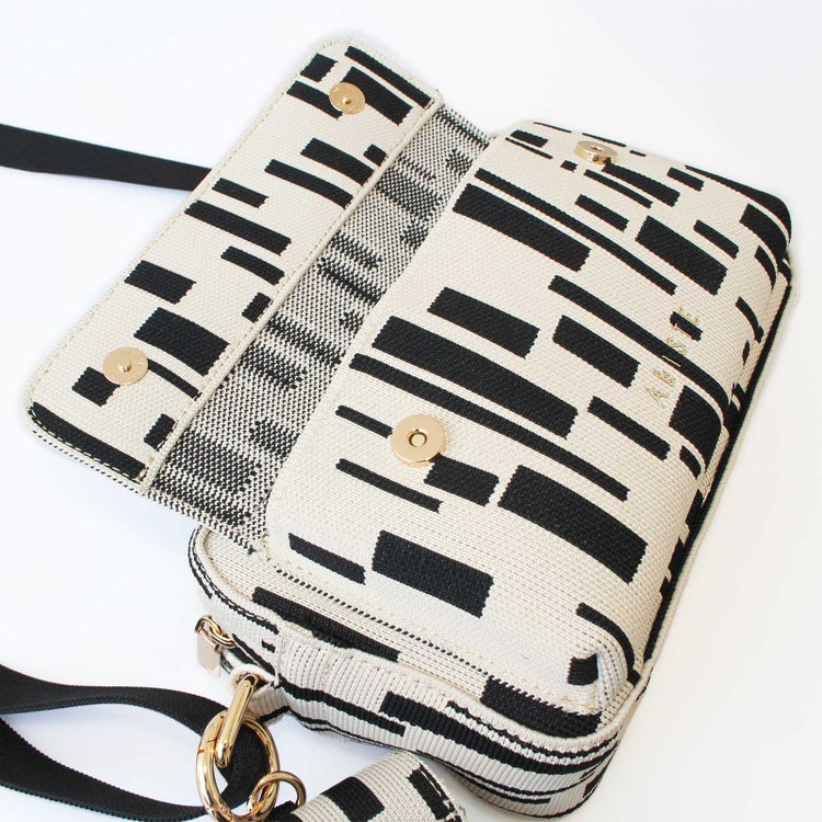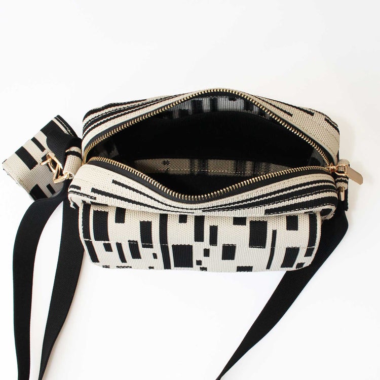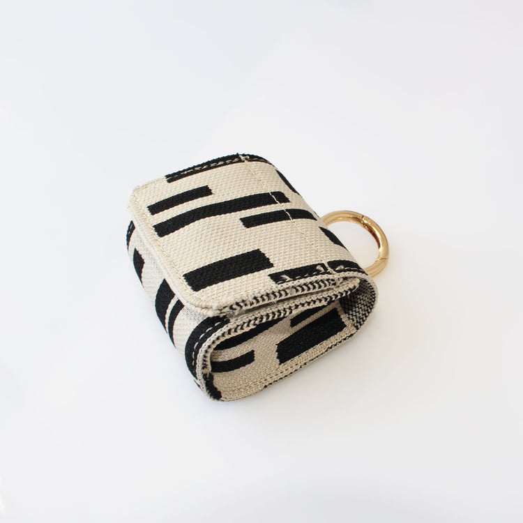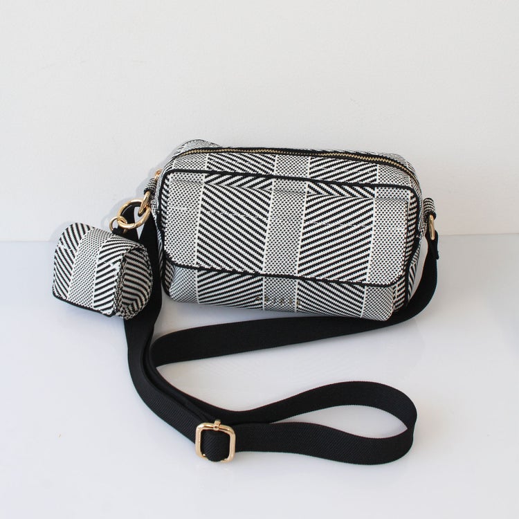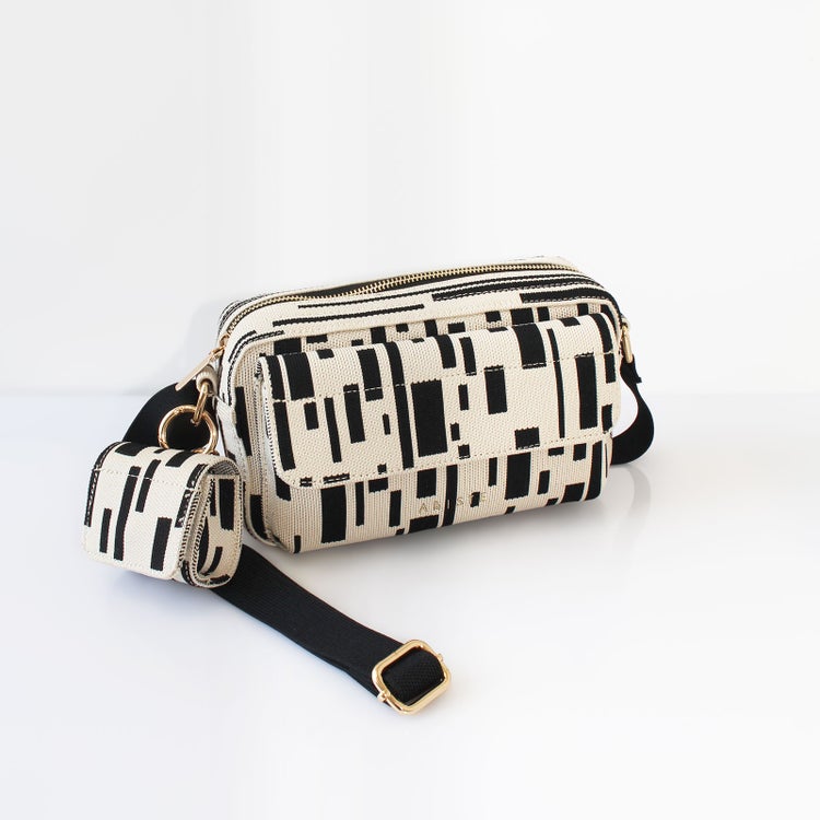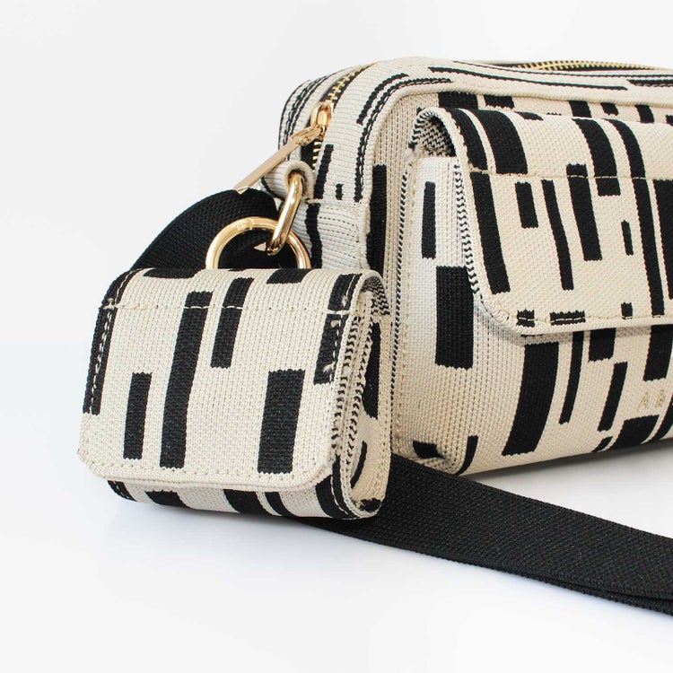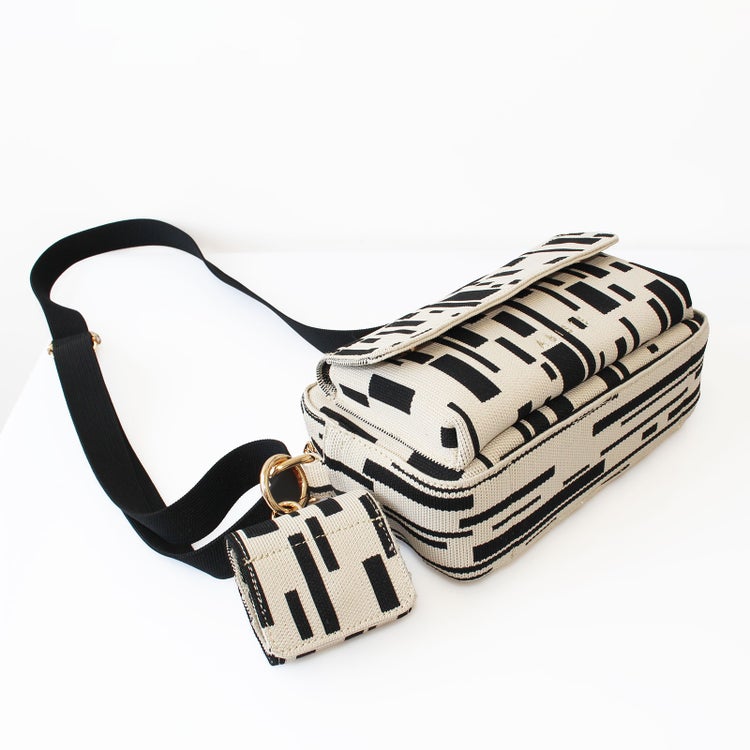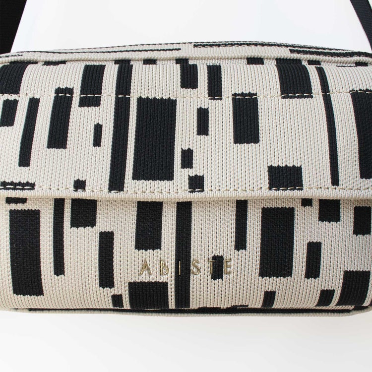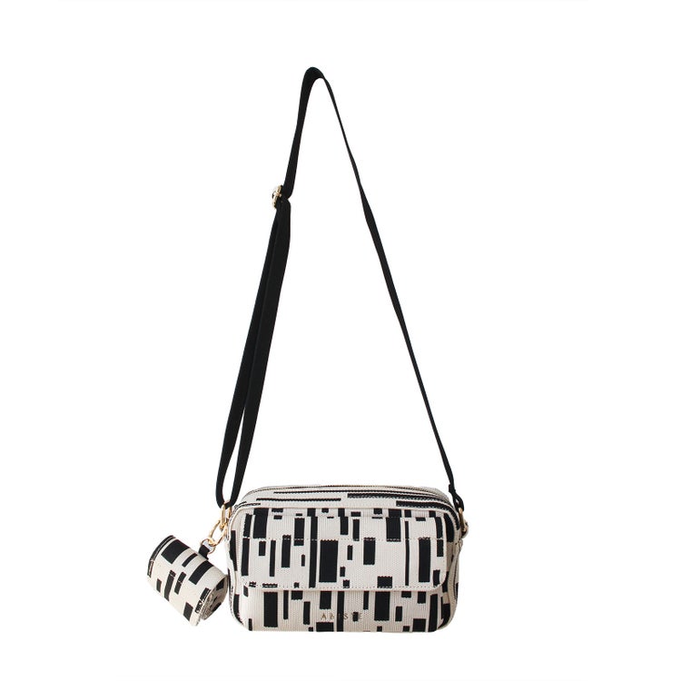 ハリのあるポリエステルニット生地で作られたショルダーバッグ。取り外し自在なミニポーチは、Air Podsの他にもリップやコンパクトなど小物を入れるのに便利です。