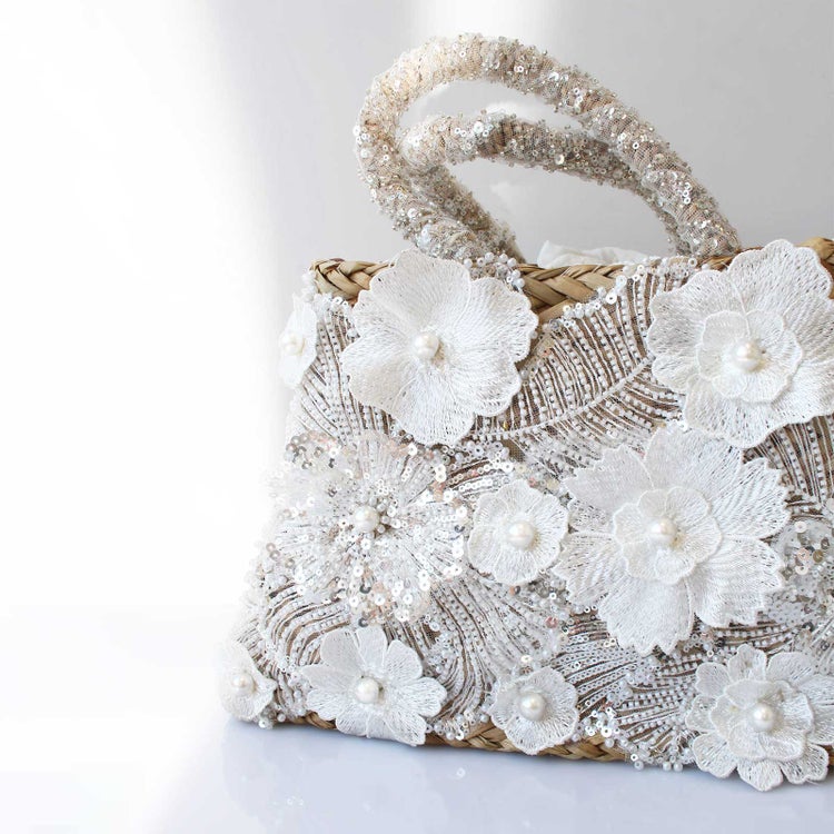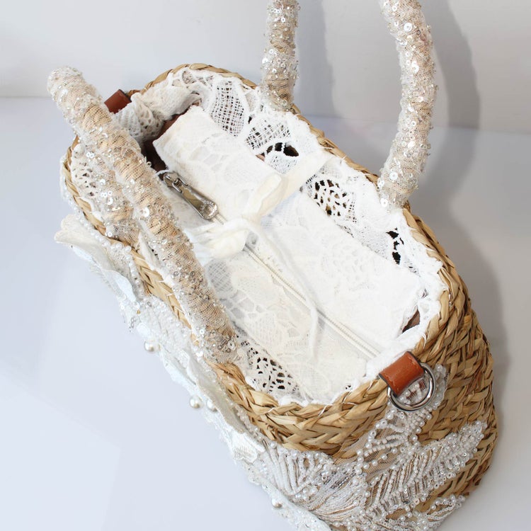 レースの花が咲き誇り、パールやビーズがきらめくロマンティックなかごバッグ。抜け感のあるおしゃれを楽しめるかごバッグに上質感が加わり、春、夏のお出かけに持つだけでときめく特別なバッグに。上部はコットンレースの紐やファスナーで閉める仕様。マチもしっかりあるのでポーチやミニタオル、折り畳み傘などお出かけに必要なものがすっぽりと収納できます。レザー調のショルダーストラップも付属。用途やシーンに合わせた使い方が可能です。