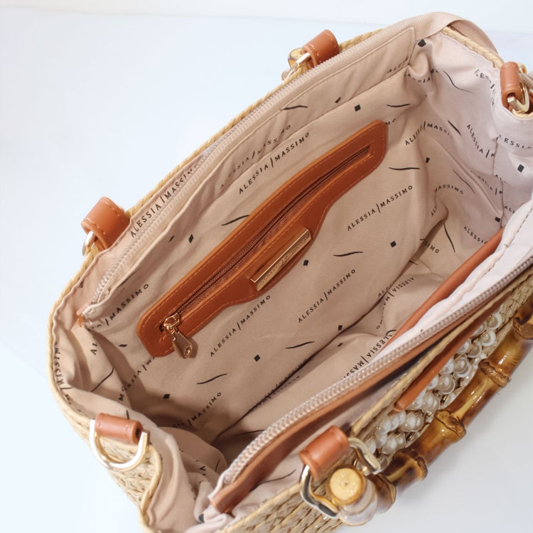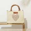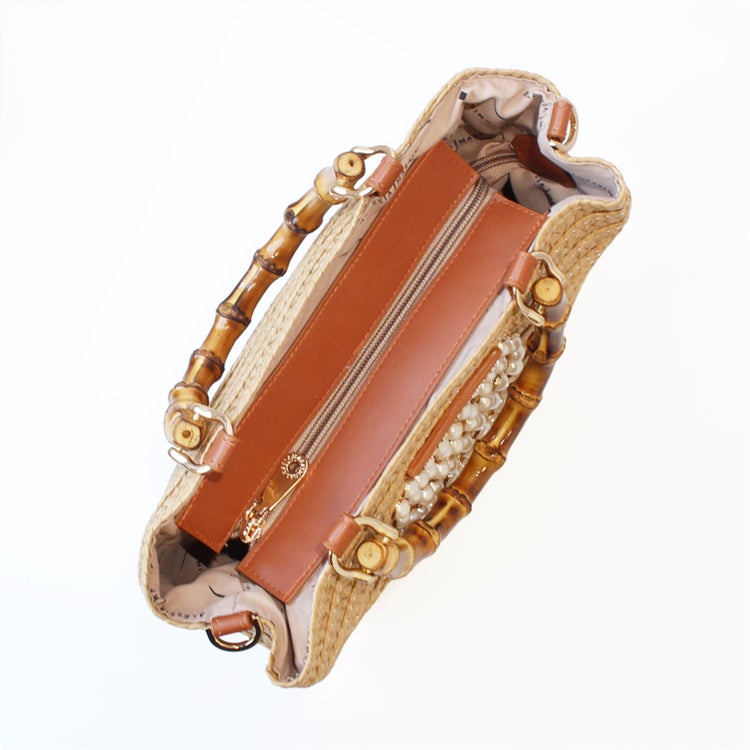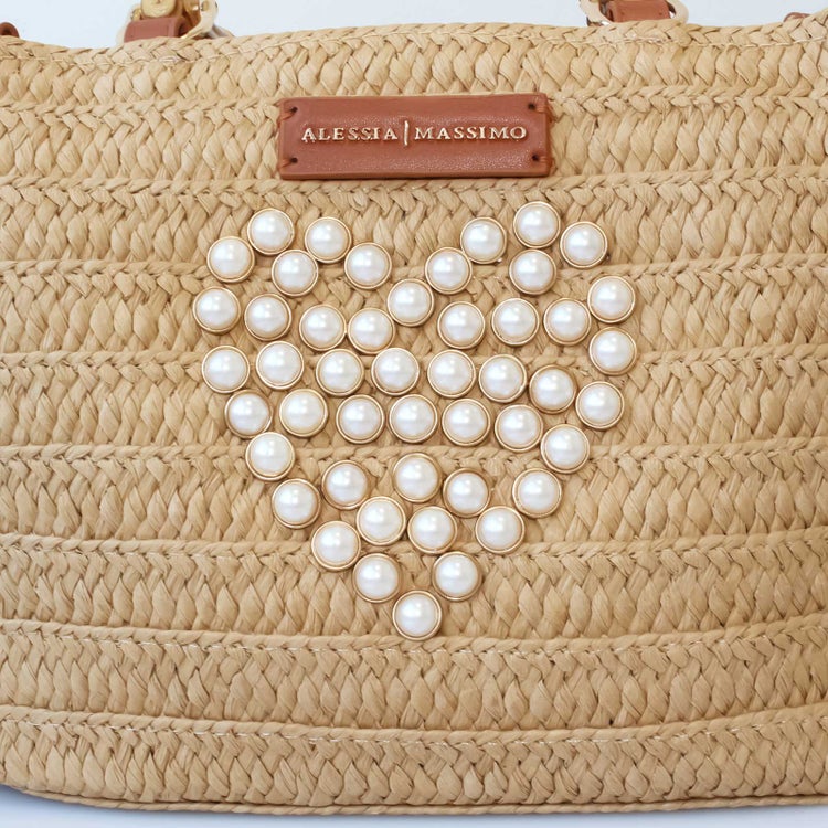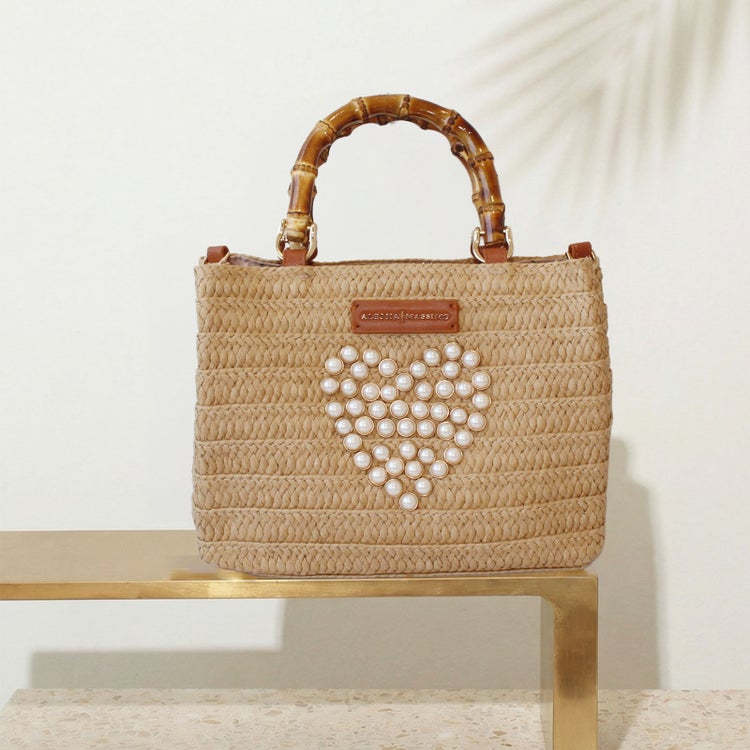 パールのハートが可愛い、ラフィアのナチュラルな光沢、質感が楽しめるバッグ。バンブーハンドルやエコレザーのブランドタグが、かごバッグならではの抜け感の中にも大人の装いにぴったりな上質さをプラスしてくれます。ポーチ、折り畳み傘、ハンカチ、長財布が入る、日常使いにもお出かけにも使いやすいサイズ。