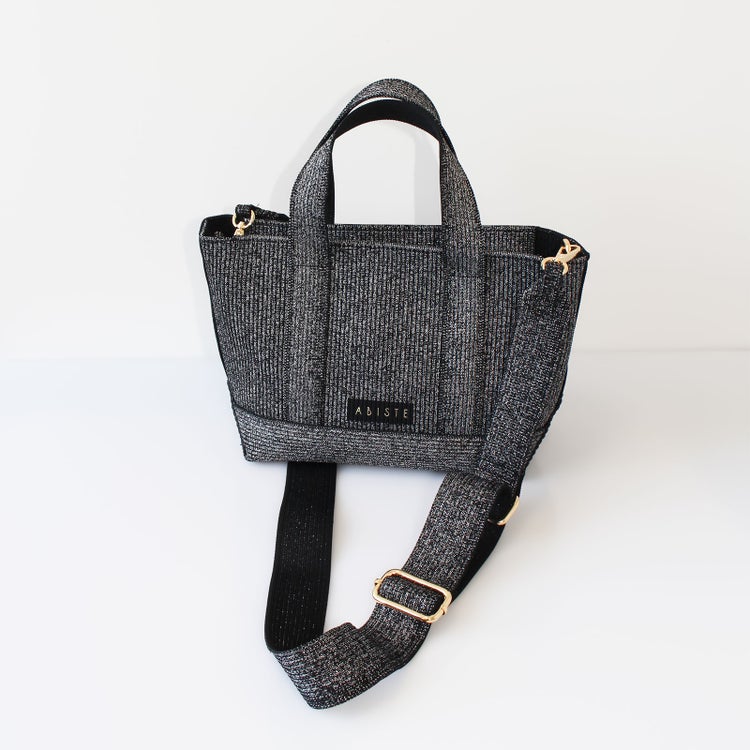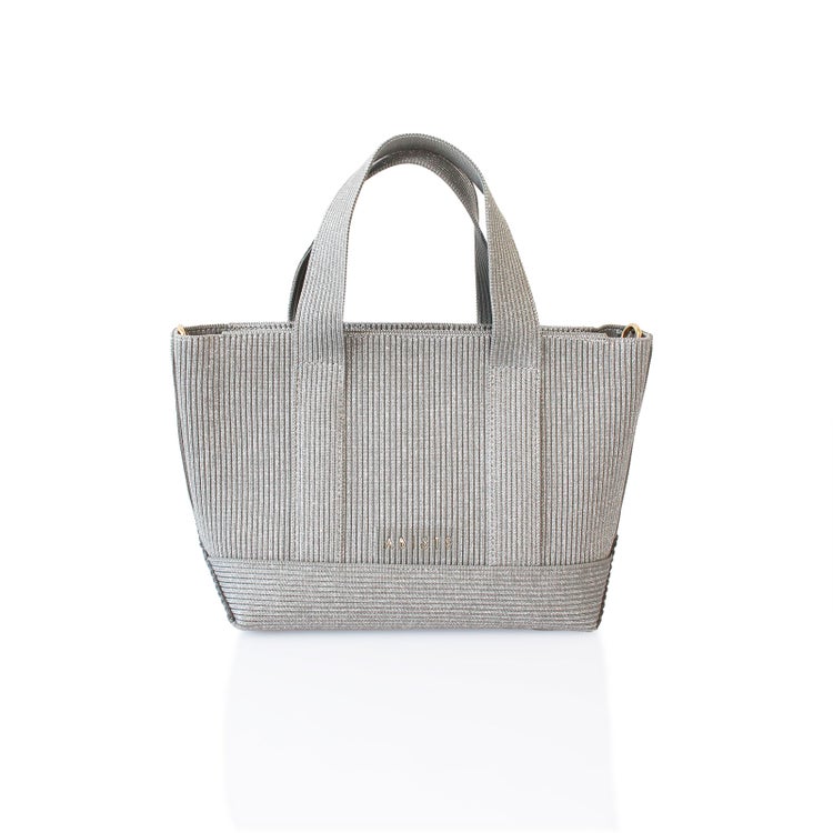 スリット糸がキラキラと輝く、ハリのあるポリエステルニットで作られたオリジナルトートバッグ。バッグのデザインに合わせて取り入れた新しいABISTEのロゴがスタイリッシュで新鮮。