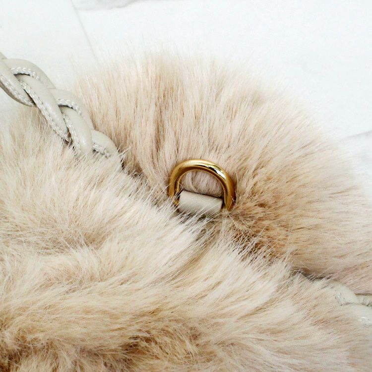 コロンと丸みのあるシルエットが大人かわいいふわふわのエコファーバッグ。エコレザーを編み込んだハンドルでかわいらしさをUPしています。開閉部分はゴムで巾着のように絞ったデザインにマグネットボタンが付いているので、人混みや移動中も安心。チェーンをつければショルダーバッグとしてもご利用いただける2way仕様です。内側にはポケット2つ付き。小ぶりながらしっかりとマチがあり、貴重品やコスメポーチなど日常に必要な量のお荷物を十分に収納できるサイズです。
