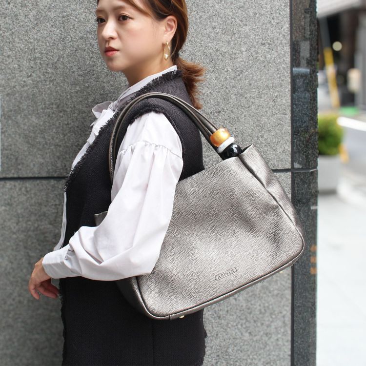 ZSiSKA (シスカ)製のパーツをハンドルに通したアビステオリジナルバッグ。メタリックなながらも程よい落ち着きがあるカラーで、品良くお使いいただけます。マチも広くA4サイズも入る大きさなので、収納力もたっぷり。