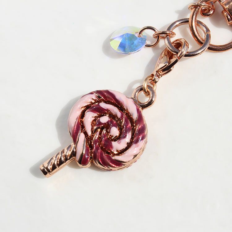 棒つきキャンディをモチーフにしたポップで大人可愛いキーホルダー。裏面もエナメル樹脂で同色のカラーリングが施されています。鍵を取り出すたび、キラキラのロリポップが気持ちを明るくしてくれそう。ポーチなどのファスナーの引き手に付けるのもおすすめです。