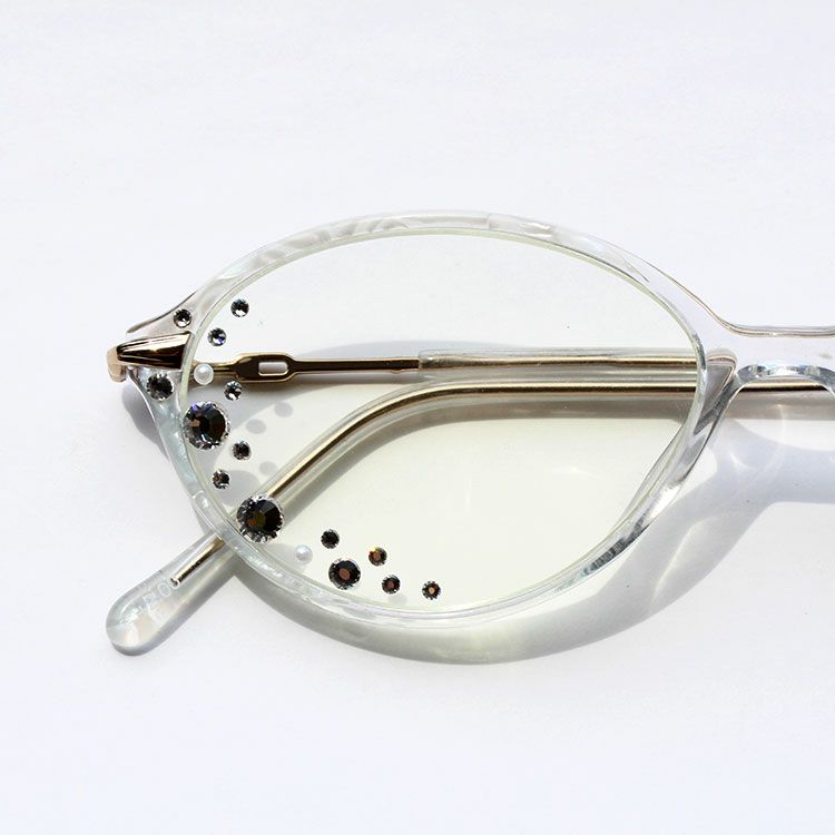 レンズフェイスサイドに散りばめられたクリスタルガラスがお顔まわりを華やかにしてくれます。ところどころにあしらわれたプラスチックパールがより一層フェミニンな印象に。