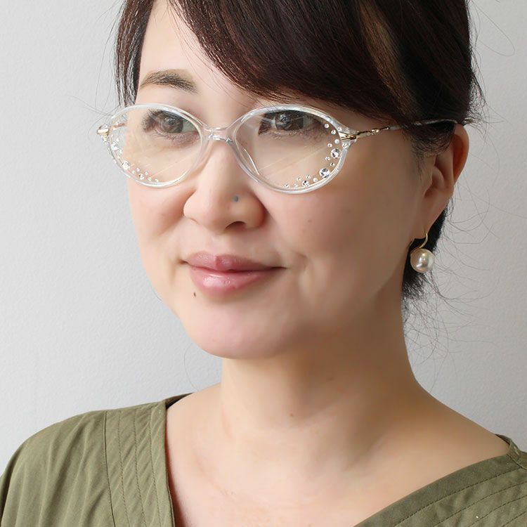 レンズフェイスサイドに散りばめられたクリスタルガラスがお顔まわりを華やかにしてくれます。ところどころにあしらわれたプラスチックパールがより一層フェミニンな印象に。