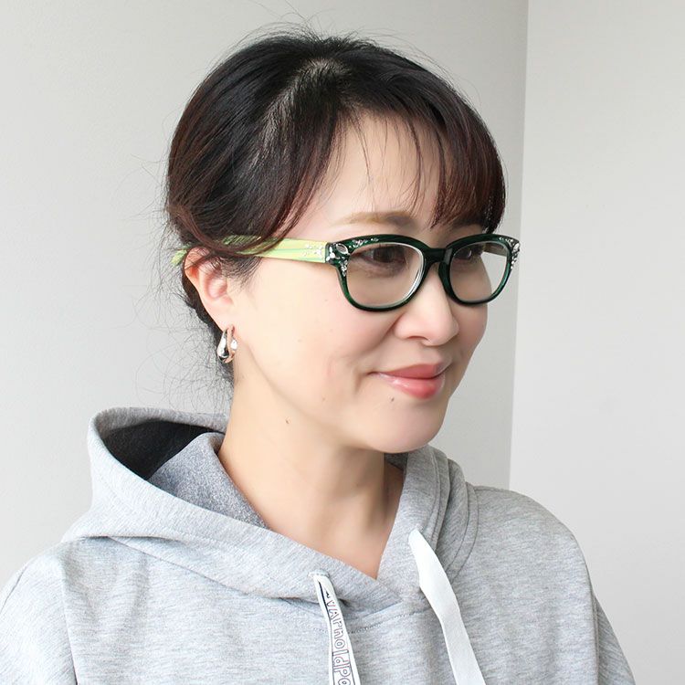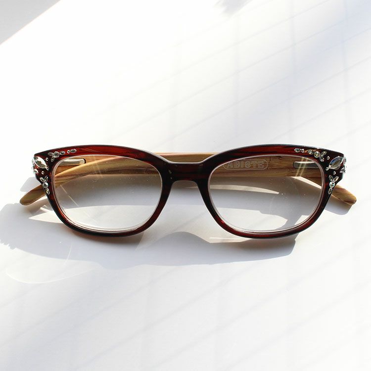 ウッドフレームのサイドにはキラキラ煌めくガラスがちりばめられ、目元がぱっと華やかになります。