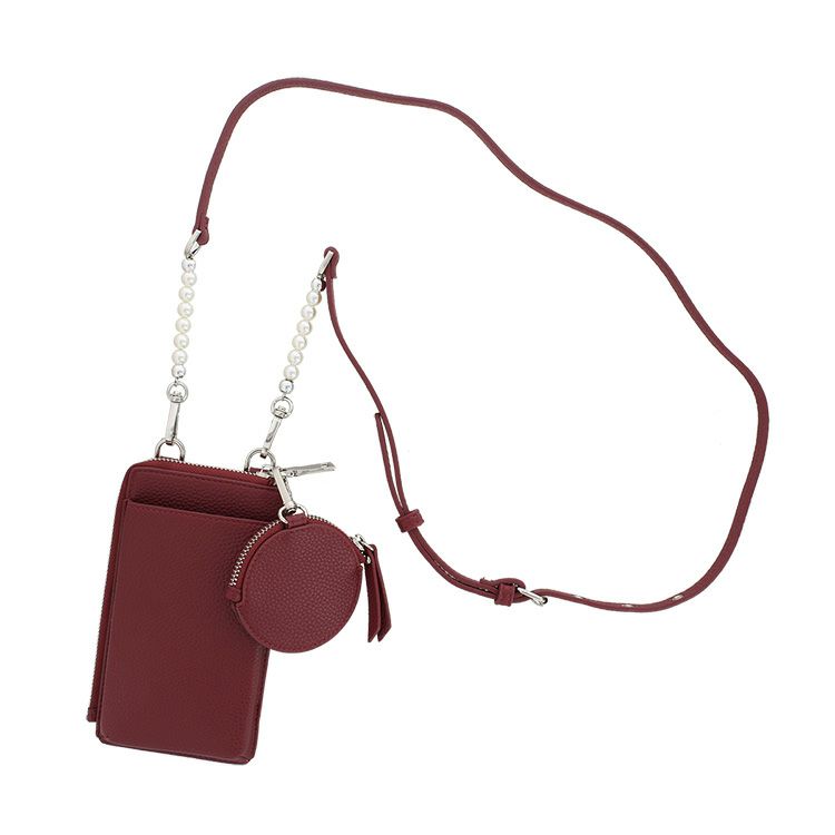 長さ調節可能なストラップにはパールをあしらい、カジュアルになりがちなフォンポーチに大人のエレガントな要素を投入。さらに、明るすぎないカラーもポイント。ダークなレッドは様々なカラーとの相性が良く、ぐっとおしゃれ度を上げてくれます。