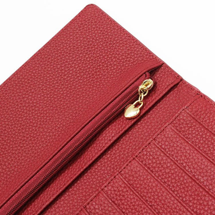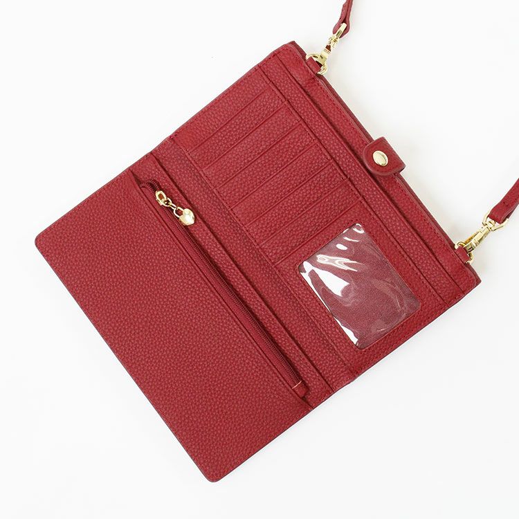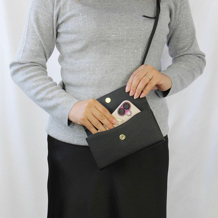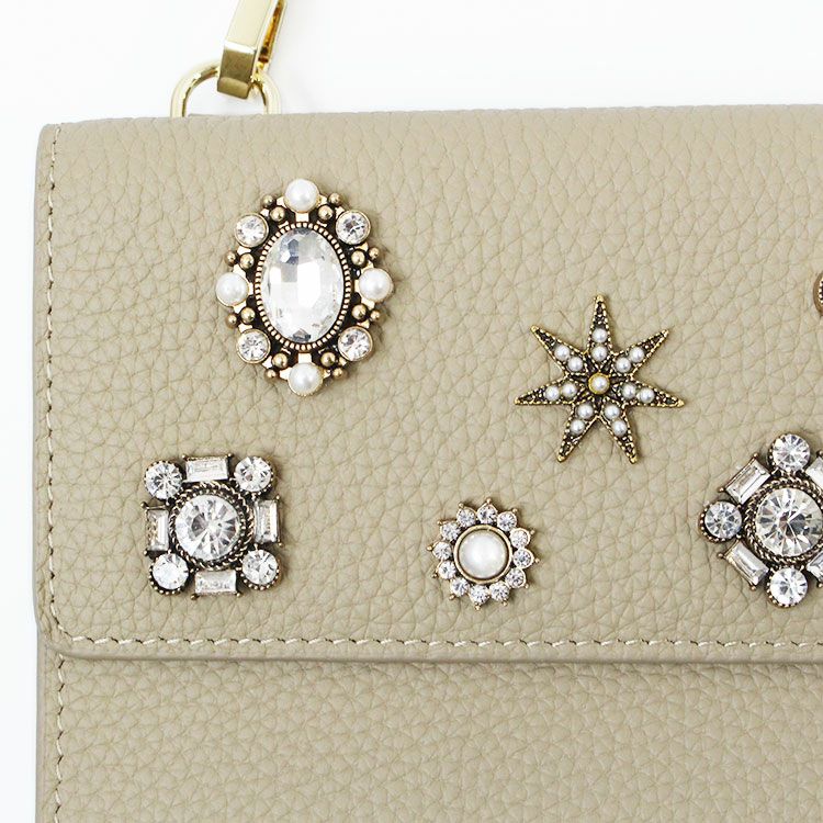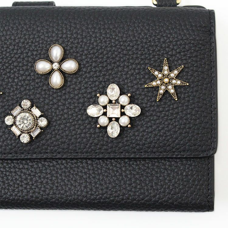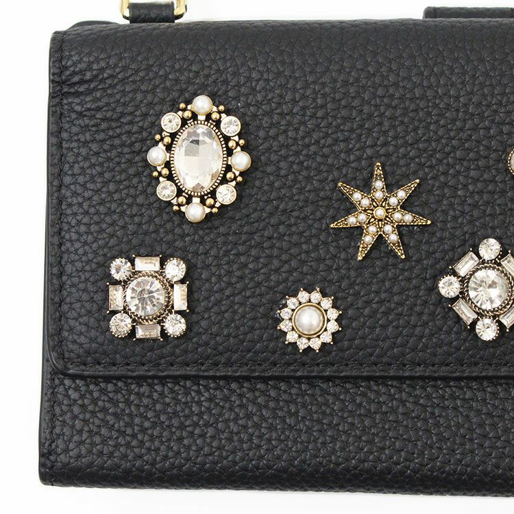 マットな質感の上品なシボレザー(牛革)に様々なビジューストーンを配した財布機能付きのショルダーバッグ。スマートフォンが入れられる正面のフラップポケットは三角形のマチにすることで大きく開いて取り出しやすいよう設計されています。背面はカードポケットが充実した財布になっており、チャーミングなハート型引き手のファスナーポケットには小銭が収納可能。