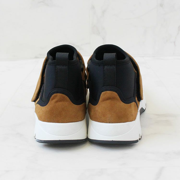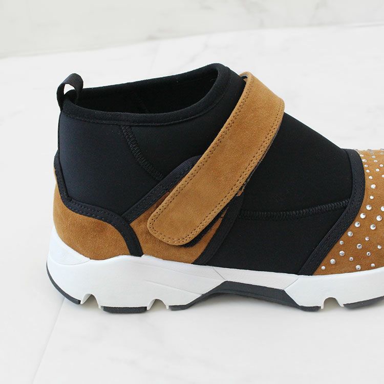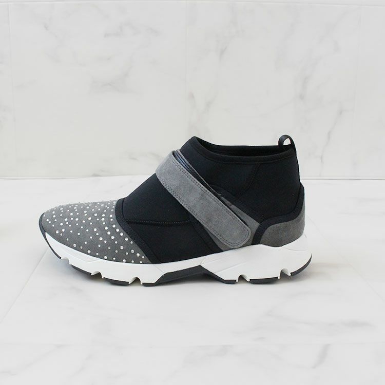 キラキラのクリスタルガラスがあしらわれたスエード調生地とウェットスーツのような柔らかい生地が用いられたスニーカー。スポッと履くことができ、ベルクロでフィット感の調節が可能。
