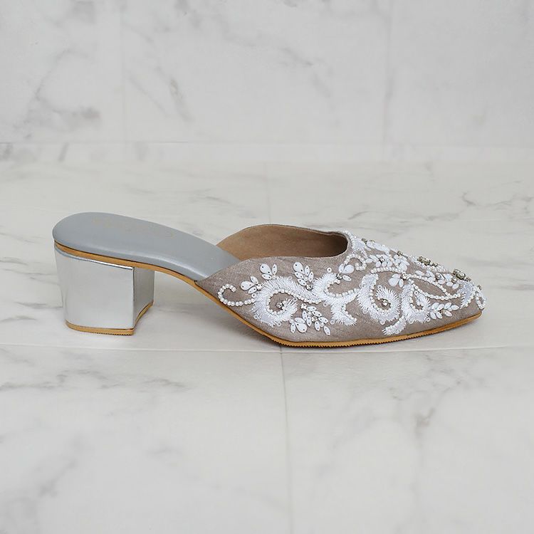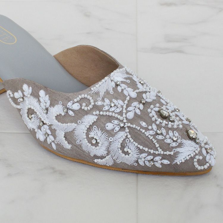 優しいグレージュの生地に真っ白な糸、ビーズやクリスタルガラスで華やかな刺繍が施されたミュール。立体感のある刺繍は職人によって一つひとつ丁寧に作られています。