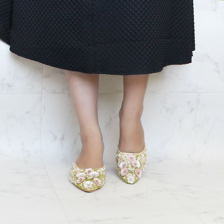 スパンコールやビーズで華やかな刺繍を施されたミュール。立体感のある刺繍は職人によって一つひとつ丁寧に作られています。