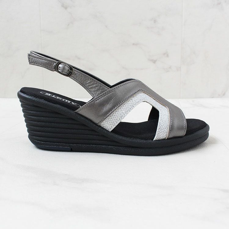 メタリックな牛革とラメ感のある素材を組み合わせたウェッジソールサンダル。