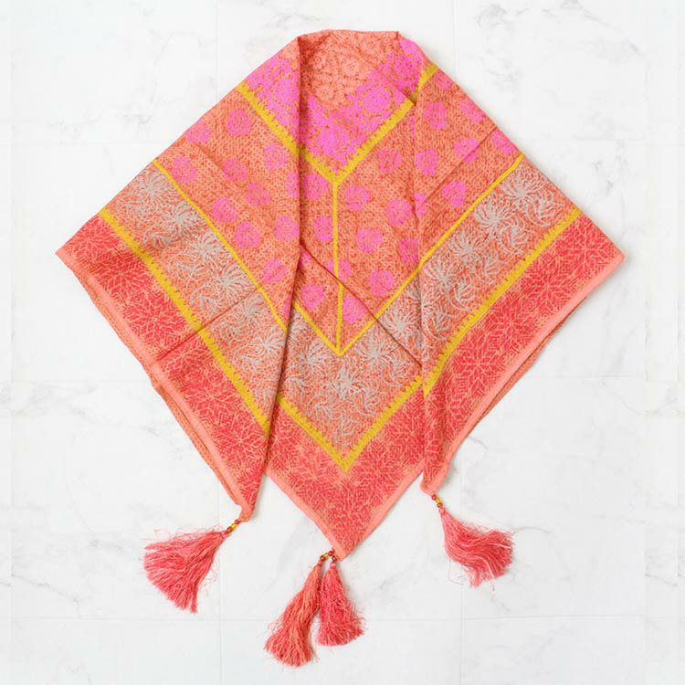 鮮やかな色合いの大判ストール。インド織物に更紗プリントが施された手の込んだ一品です。レーヨン100%で張り感がありしっかりとした素材。シンプルなお洋服もたちまち主役級のコーデに早変わりさせてくれそう。オシャレな大人の女性にふさわしいストールです。