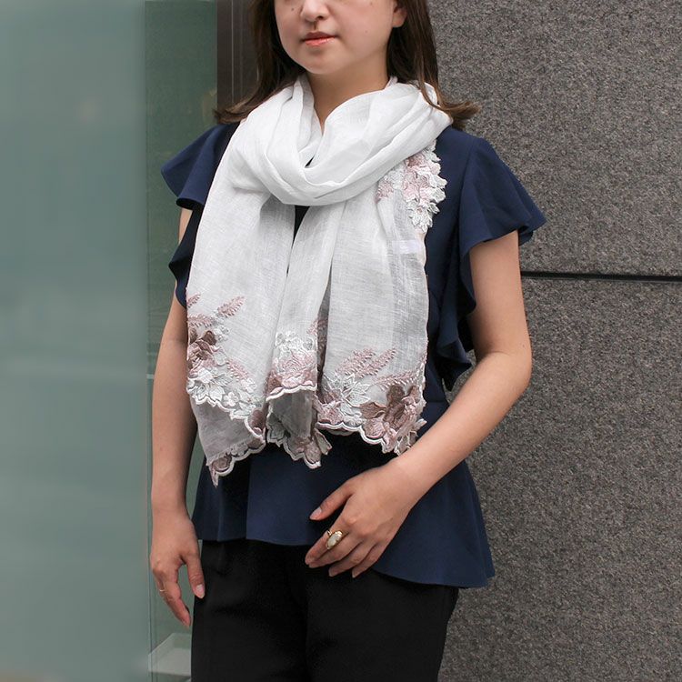 リネン100%フラワーモチーフ刺繍ストール/2253015-