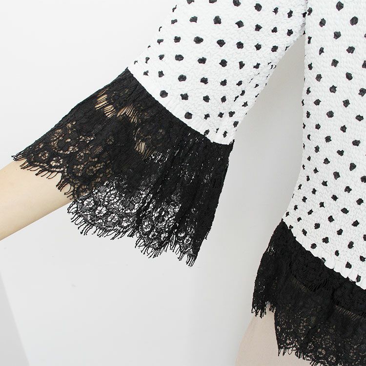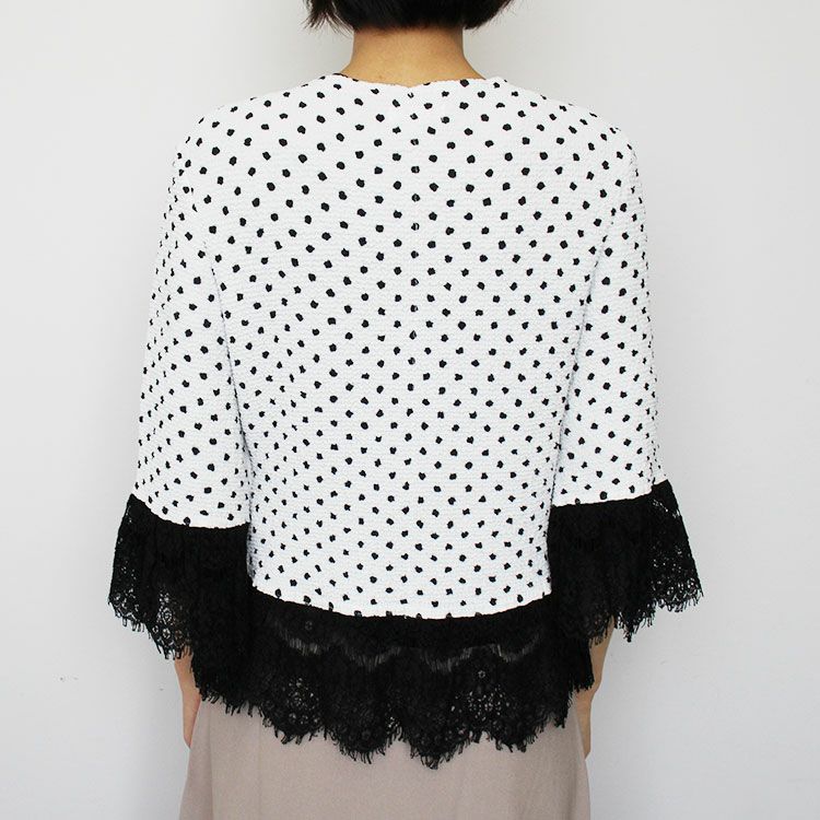 プリーツ素材で、さらっとしたタッチの羽織もの。袖、裾、胸元のレース使いがエレガントな印象です。