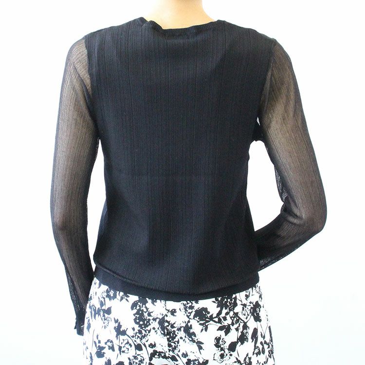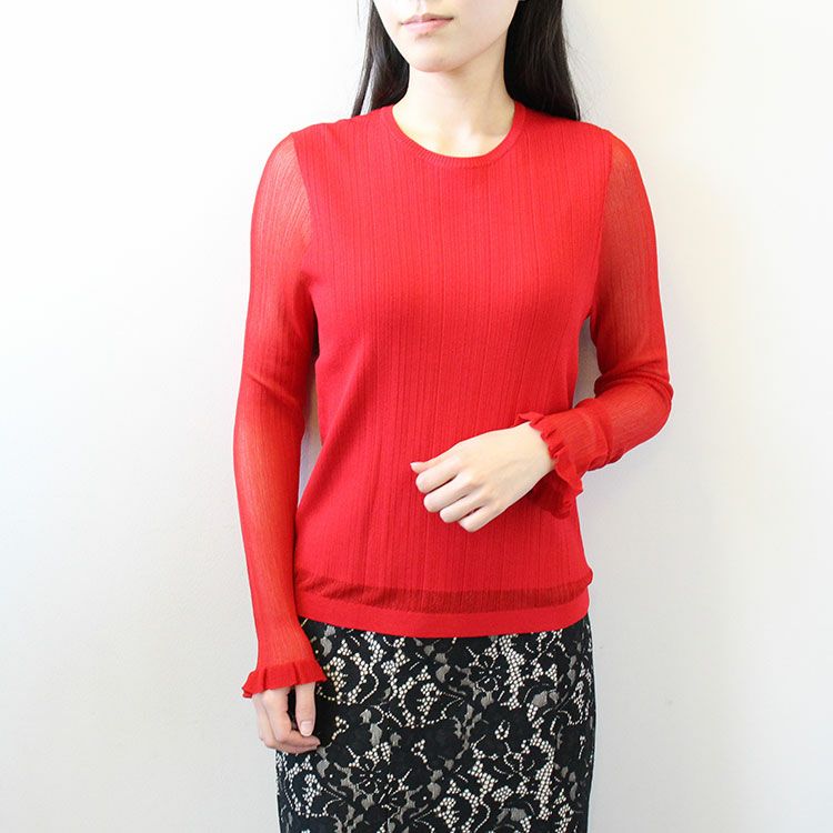 さらっとした着心地のリブニットのカットソー。シアー袖の袖口にはフリルがついていて可愛い大人の1着です。