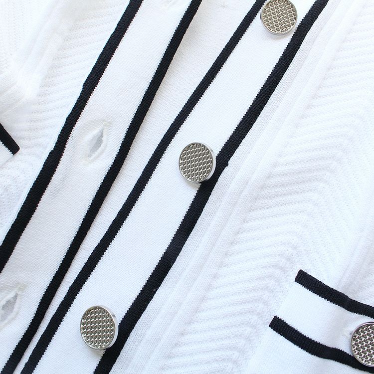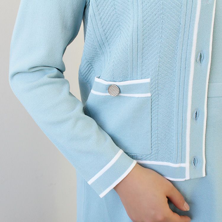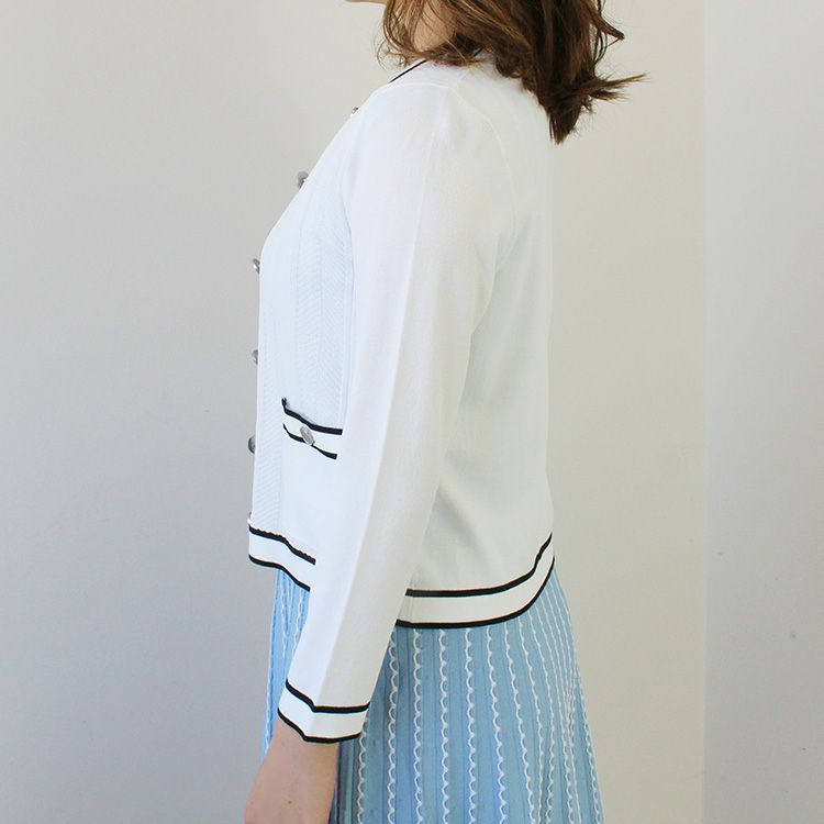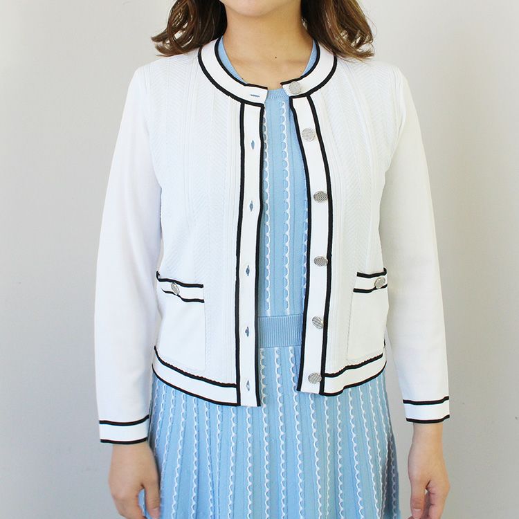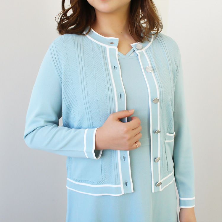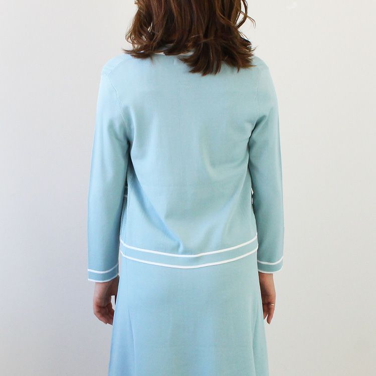 パイピングデザインがアクセントのニットカーディガン。腰骨にかかるくらいの使いやすい丈でスカートにもパンツにも合うので、冷房対策に持ち歩いたり、オフィスに置いておくのにも重宝します。オフィスカジュアルからお出かけ、ややカジュアルなセレモニーシーンまで幅広いシーンに。