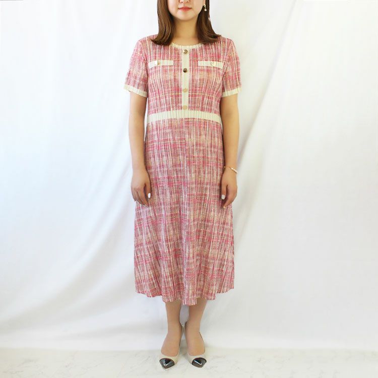 プリーツ素材のロング丈ワンピース。さらりとして伸縮性に富んだ素材で楽な着心地ながら、縦プリーツですっきりとした印象に。金ボタンと切り替えデザインがアクセントになり、これ一枚でおしゃれに仕上がります。