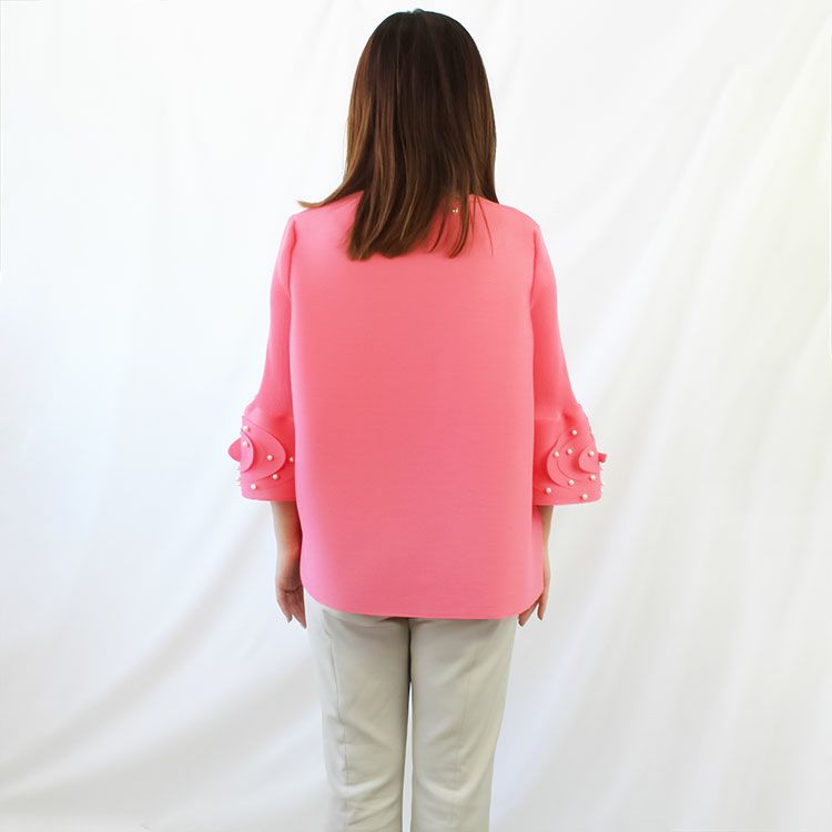 横プリーツが弾むプルオーバー。ハンドプリーツで仕上げたさらりとした質感の生地を使用し、楽な着心地ながらもきちんとした印象に見せてくれるデザイン。フレア袖にはパールをあしらい、上品さと華やかさをプラスするアクセントに。食事会やセレモニーなど、かしこまったシーンにもご使用いただけます。