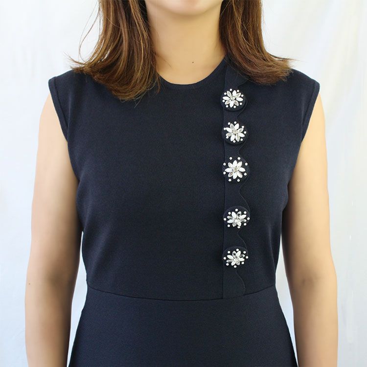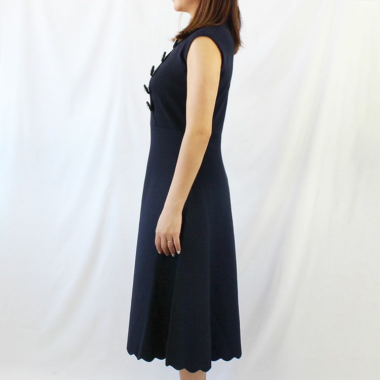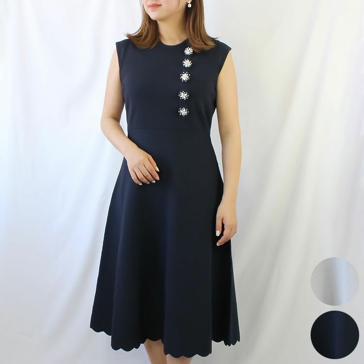 クリスタルガラスやパールなどで装飾されたくるみボタンが、デザインのアクセントに。落ち着いたカラーの品の良いワンピースは、シーンを選ばず活躍します。