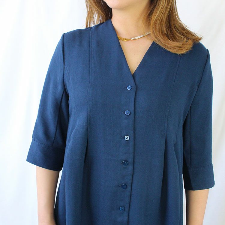 シャープなVネックの首元にはネックレス、手元にブレスレットやバングルをプラスすれば、シンプルなワンピースがたちまち華やかに。
