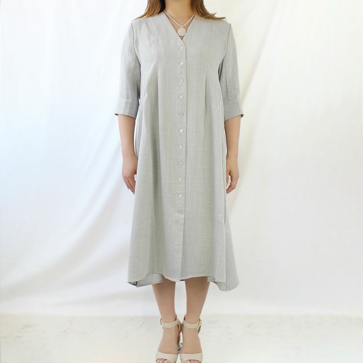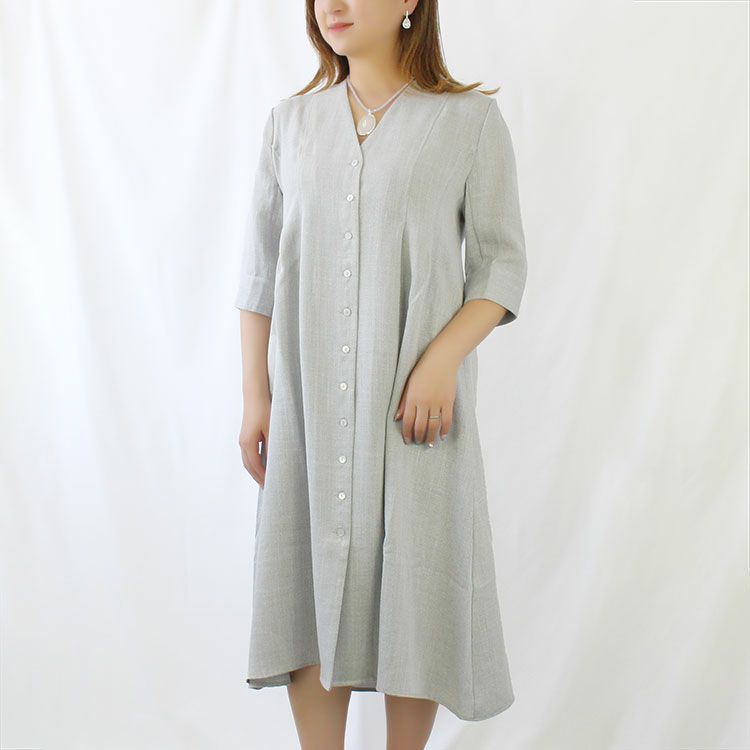 さらりとした質感のナイロン混生地を使用したワンピース。裾にかけて広がるデザインで足捌きがよく楽な着心地。胸元や腰のあたりにダーツを入れ、スッキリとした印象に。
