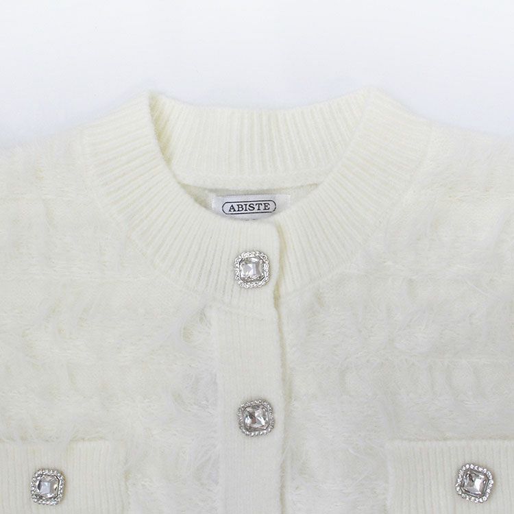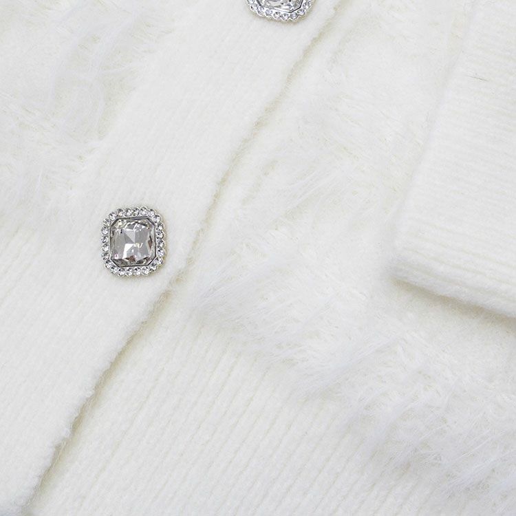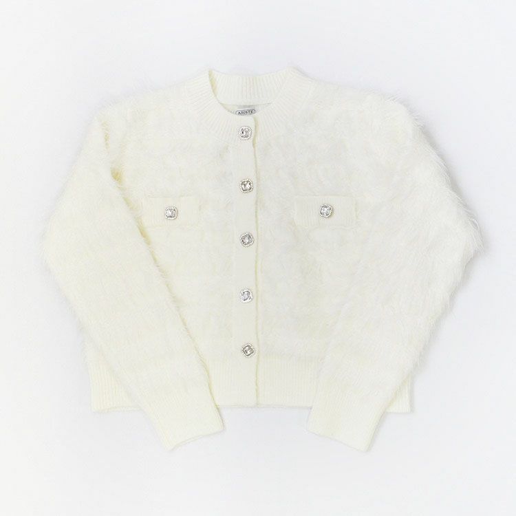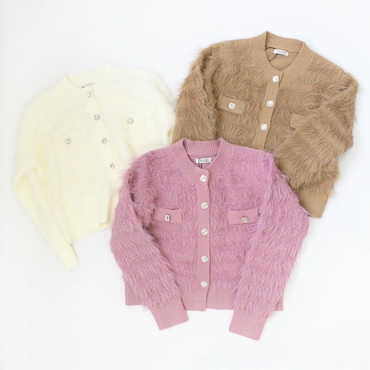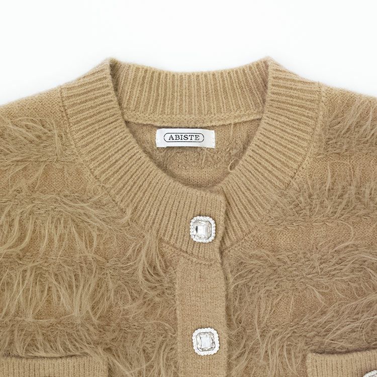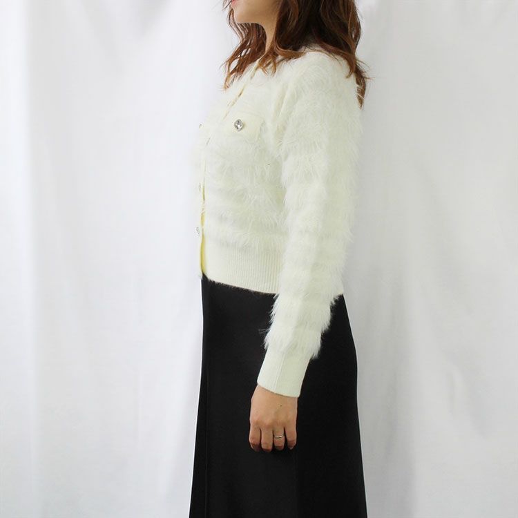 毛足の長いふわふわのニットが季節ならではの楽しさを与えてくれる、コンパクトなシルエットのカーディガン。胸元のフェイクポケットできちんと感をプラスし、煌めくビジューボタンが華やかさを後押し。大人の装いにマッチするデザインです。