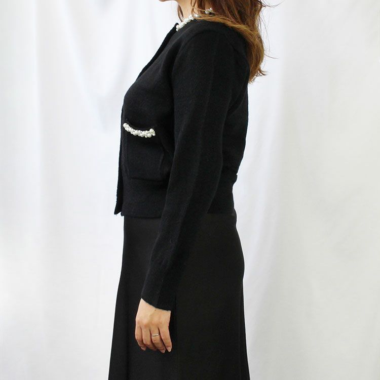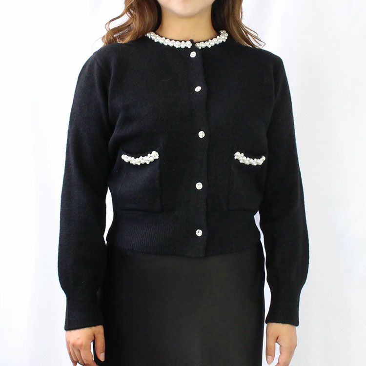 毛足の長いふわふわのニットが季節ならではの楽しさを与えてくれる、コンパクトなシルエットのカーディガン。胸元のフェイクポケットできちんと感をプラスし、煌めくビジューボタンが華やかさを後押し。大人の装いにマッチするデザインです。