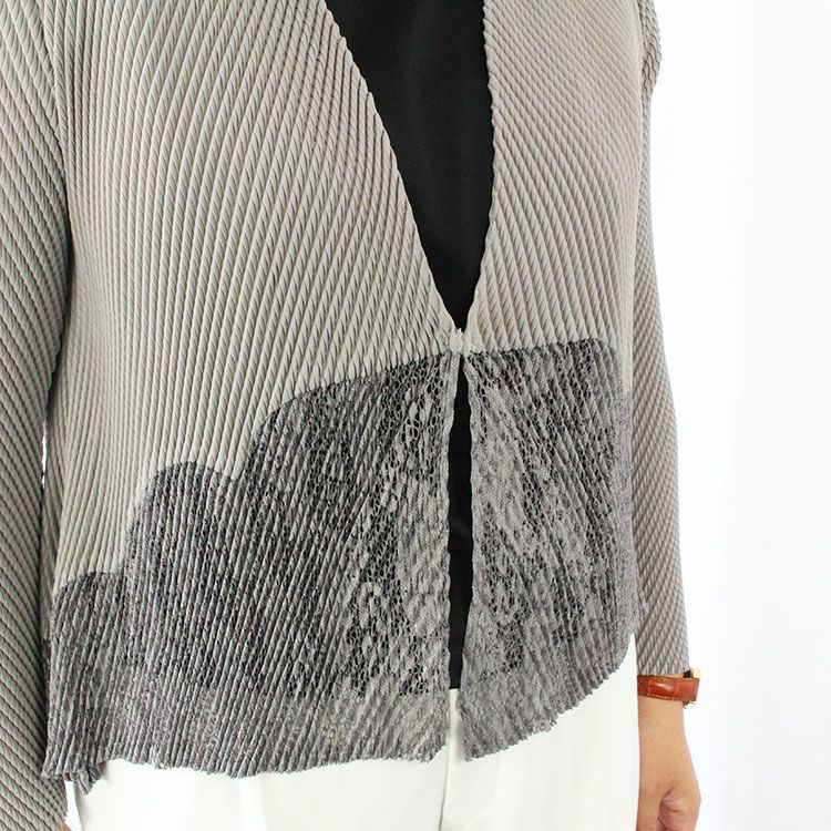 2方向から圧の異なるプリーツをかけた、波打つような表面が特徴的な生地のジャケット。軽く、シワになりにくいのでバッグにポンと入れて持ち運びが可能。旅行はもちろん、季節の変わり目の室温対策にも重宝します。