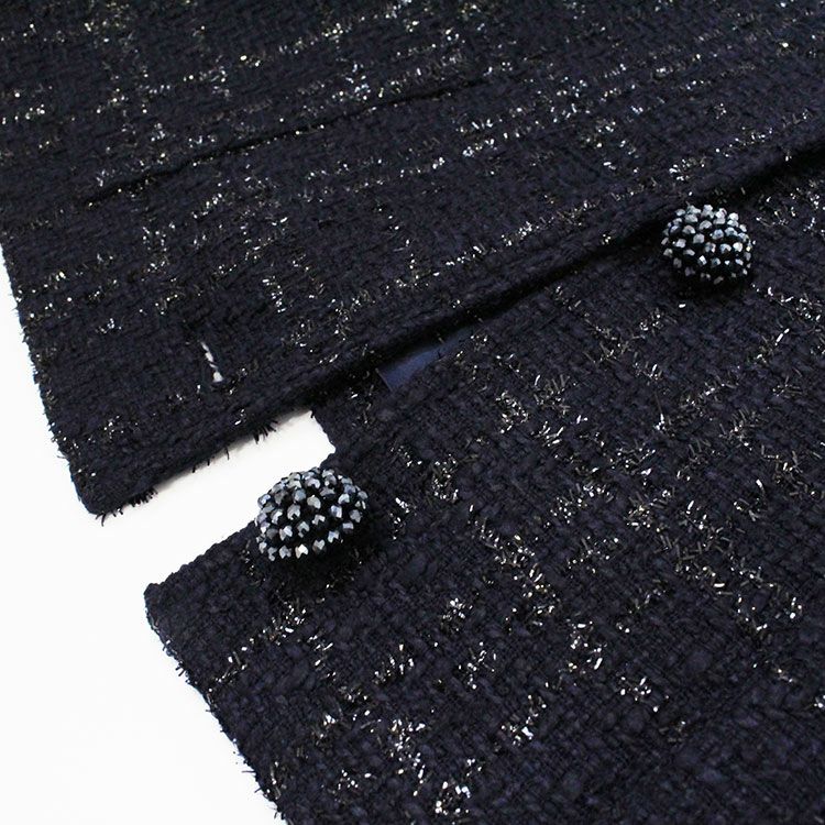 光沢感のあるスリット糸と落ち着いたネイビーの糸を織った品が良く華やかさもあるツィードジャケット。キラキラと光を反射するカットビーズのボタンがアクセントに。七五三や卒入学式、式典行事などのフォーマルな場にも、普段のお出かけにも使えるデザインです。ワンピースやスカートによく似合うやや短めの丈。ワイドパンツやデニムなどに合わせるのもおすすめです。