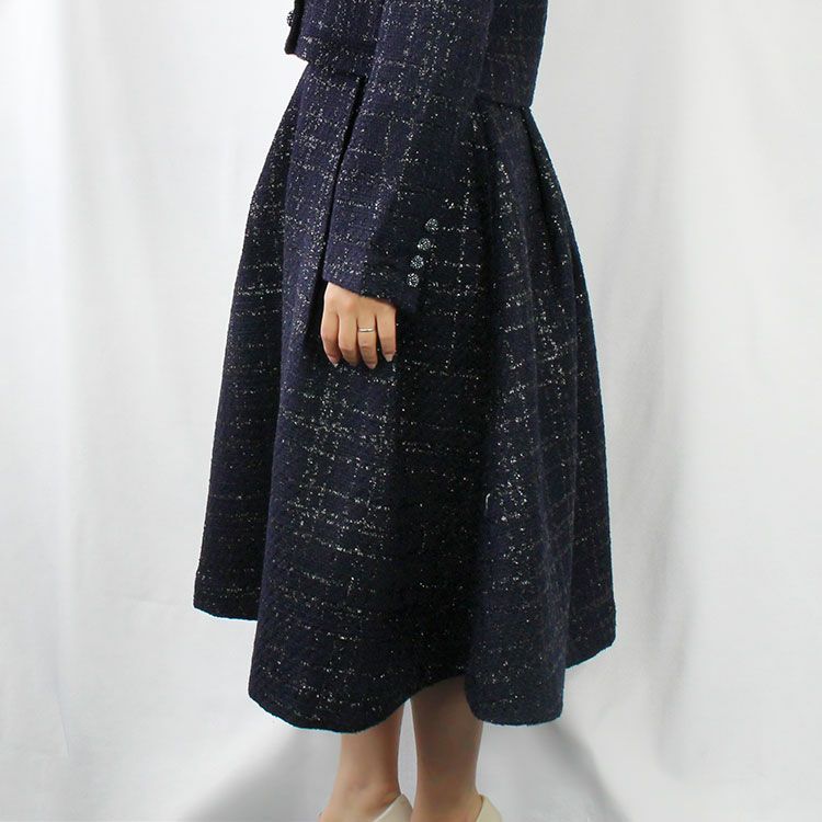 光沢感のあるスリット糸と落ち着いたネイビーの糸を織った品が良く華やかさもあるツィードスカート。七五三や卒入学式、式典行事などのフォーマルな場にも、普段のお出かけにも使えるデザインです。