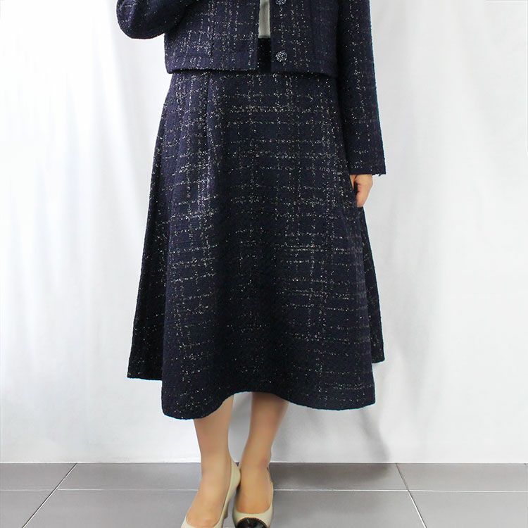 光沢感のあるスリット糸と落ち着いたネイビーの糸を織った品が良く華やかさもあるツィードスカート。七五三や卒入学式、式典行事などのフォーマルな場にも、普段のお出かけにも使えるデザインです。