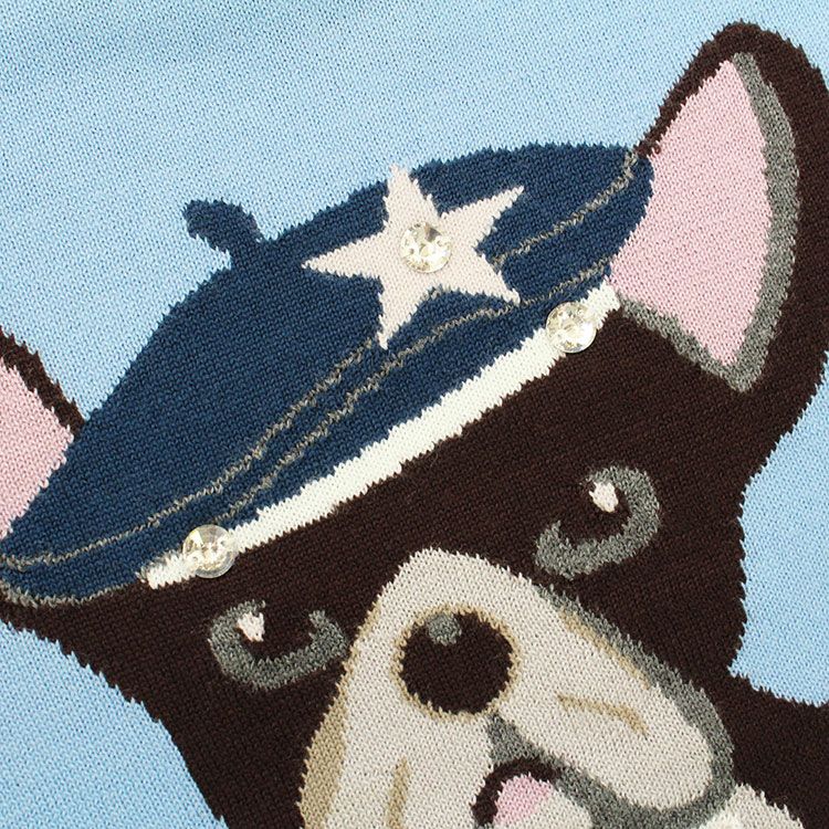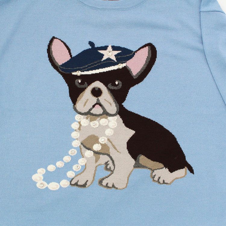 パールネックレスや帽子を身につけたおしゃれなフレンチブルドッグがキュートな、一枚で様になるデザイン。裾にかけてストレートなシルエットで落ち感があるのでスッキリとした印象に。
