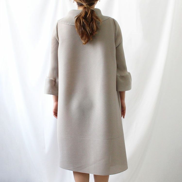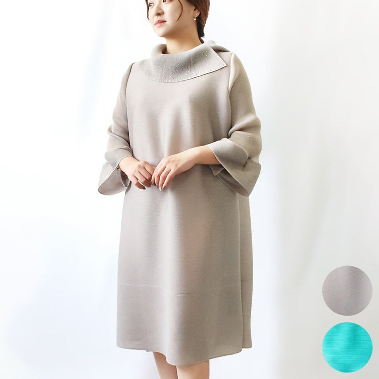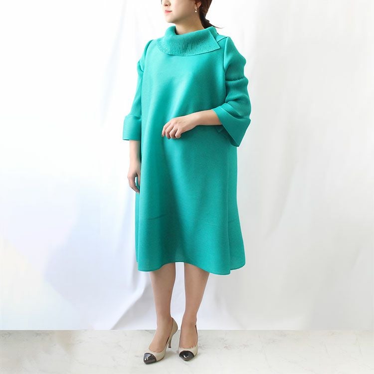 細かいプリーツをかけた生地ならではのふんわりと弾むようなシルエットを楽しめるワンピース。アシンメトリーなデザインの立ち襟にはカットガラスが煌めき華やかさをプラス。さらりとした身離れの良い生地で、快適な着心地です。