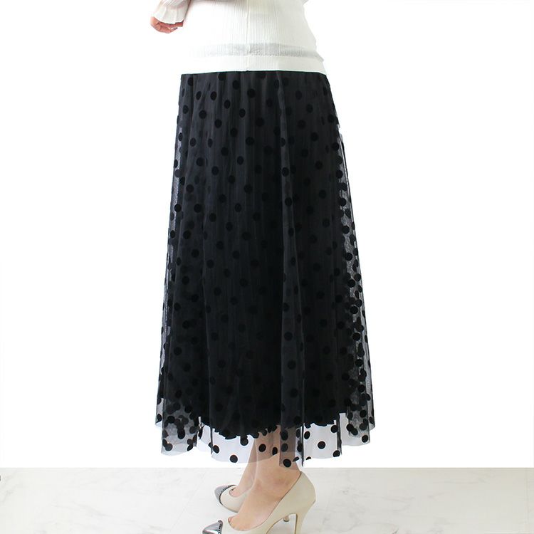 フロッキー加工の水玉模様が大人可愛いロングスカート。ウエストはゴムなので着脱しやすく、楽な履き心地です。