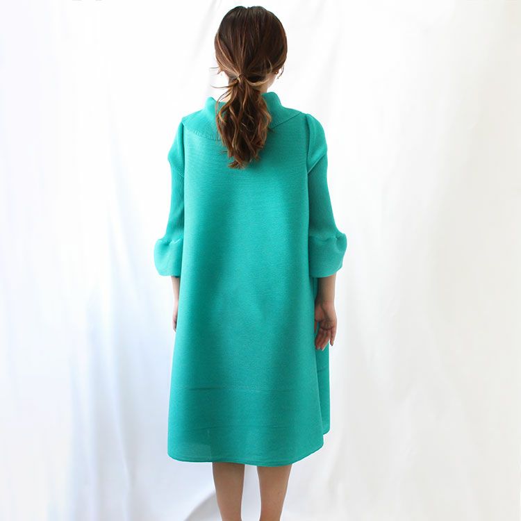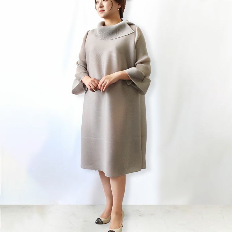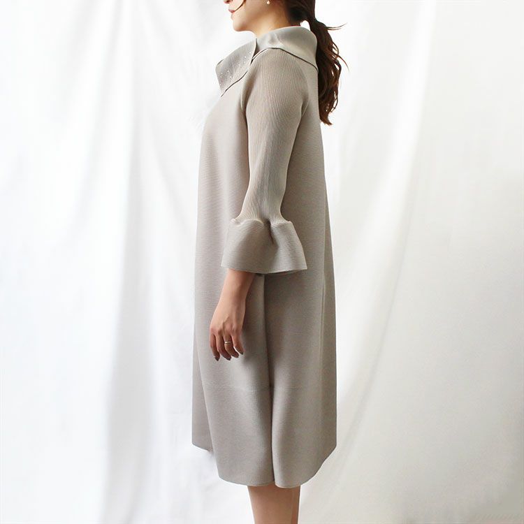 細かいプリーツをかけた生地ならではのふんわりと弾むようなシルエットを楽しめるワンピース。アシンメトリーなデザインの立ち襟にはカットガラスが煌めき華やかさをプラス。さらりとした身離れの良い生地で、快適な着心地です。
