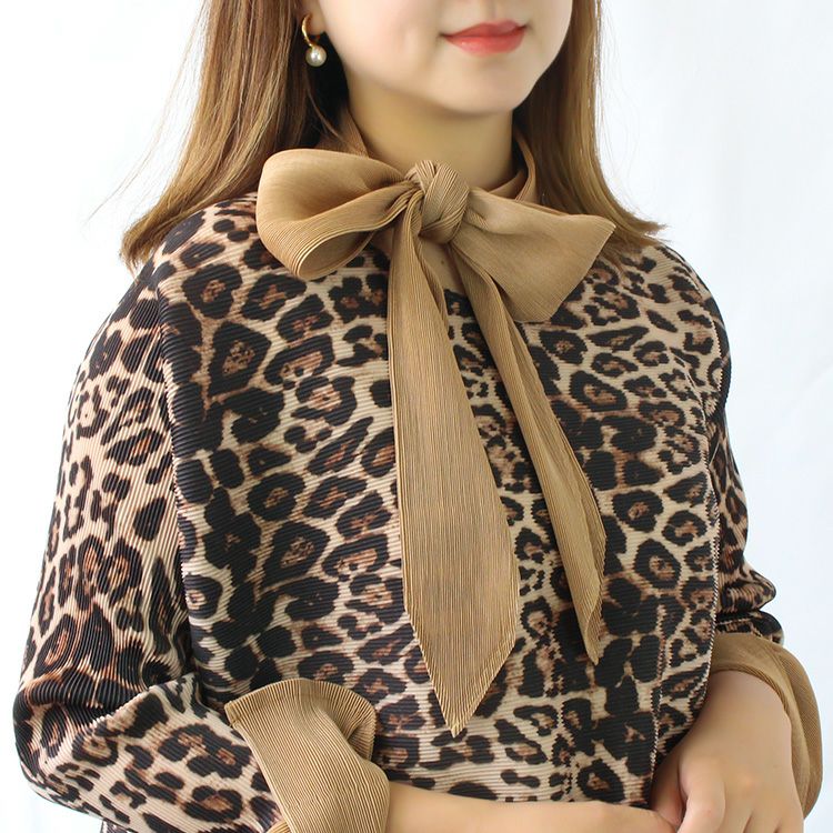 秋冬のトレンド、レオパード柄のプリーツ素材プルオーバー。締め付け感や窮屈さがなく質感もさらりとしているので快適な着心地です。