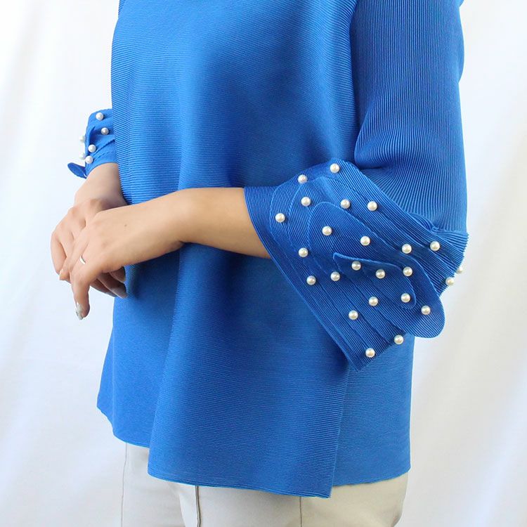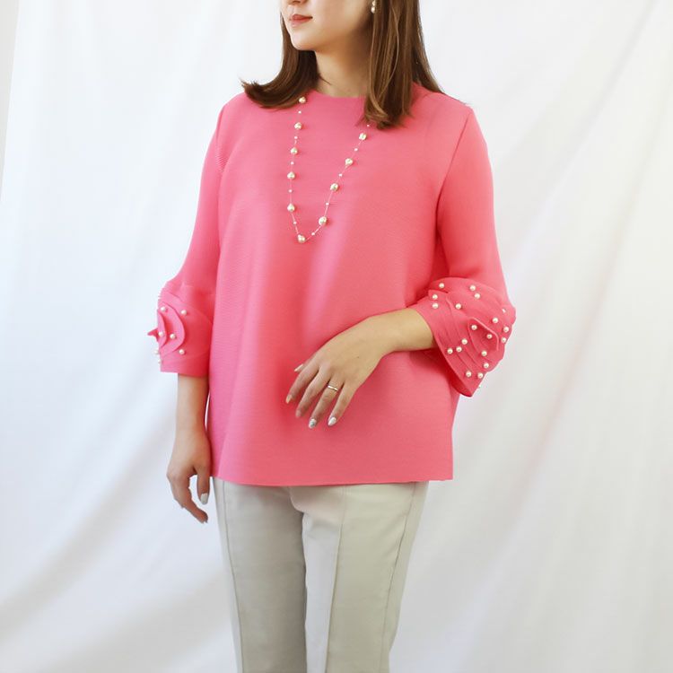 横プリーツが弾むプルオーバー。ハンドプリーツで仕上げたさらりとした質感の生地を使用し、楽な着心地ながらもきちんとした印象に見せてくれるデザイン。フレア袖にはパールをあしらい、上品さと華やかさをプラスするアクセントに。食事会やセレモニーなど、かしこまったシーンにもご使用いただけます。